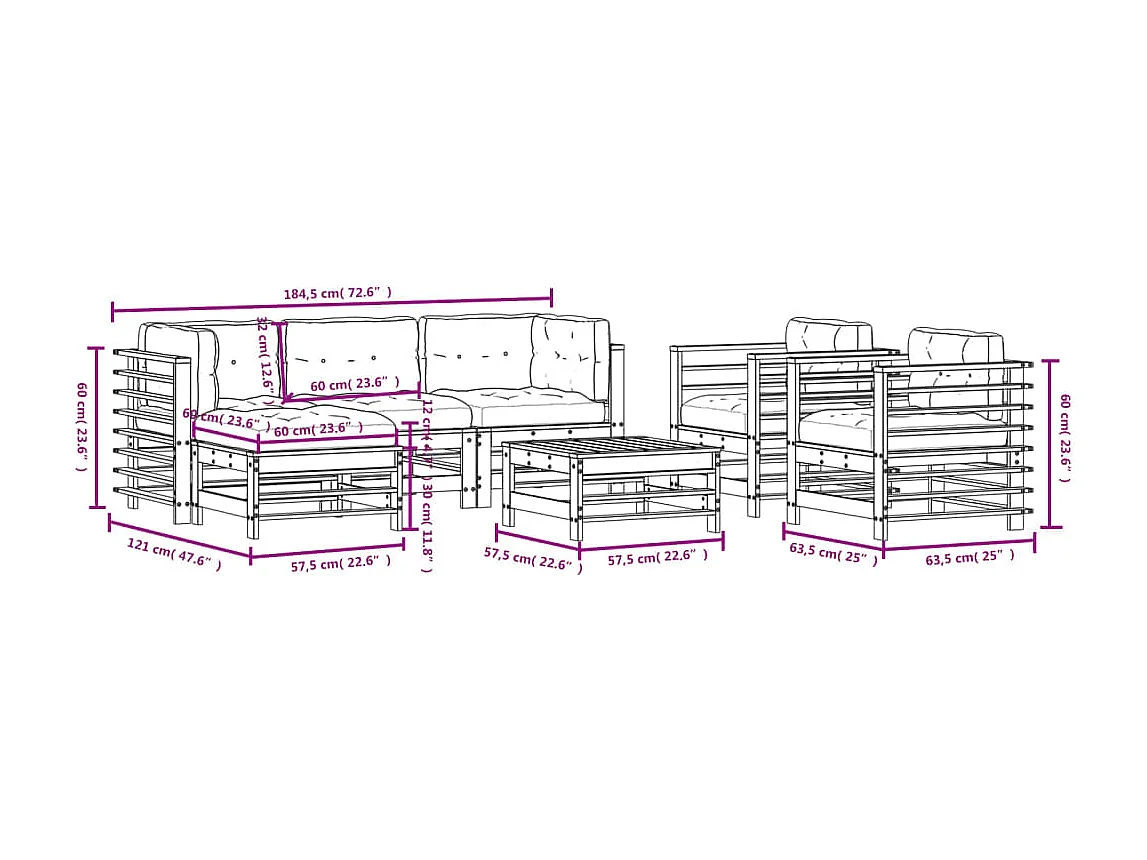 Salon de jardin 7 pcs avec coussins gris bois massif