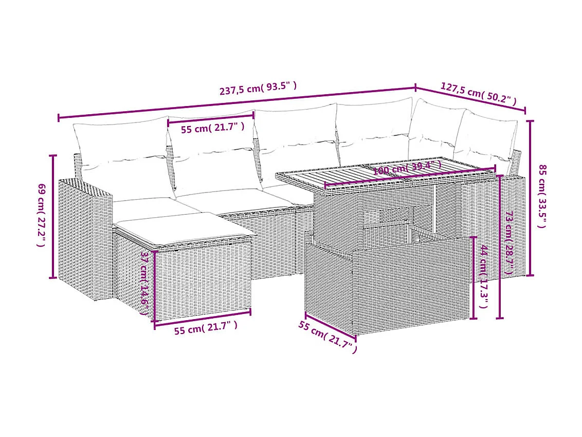 Salon de jardin 7 pcs avec coussins noir résine tressée