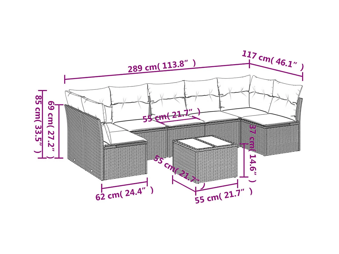 Salon de jardin 8 pcs avec coussins gris clair résine tressée
