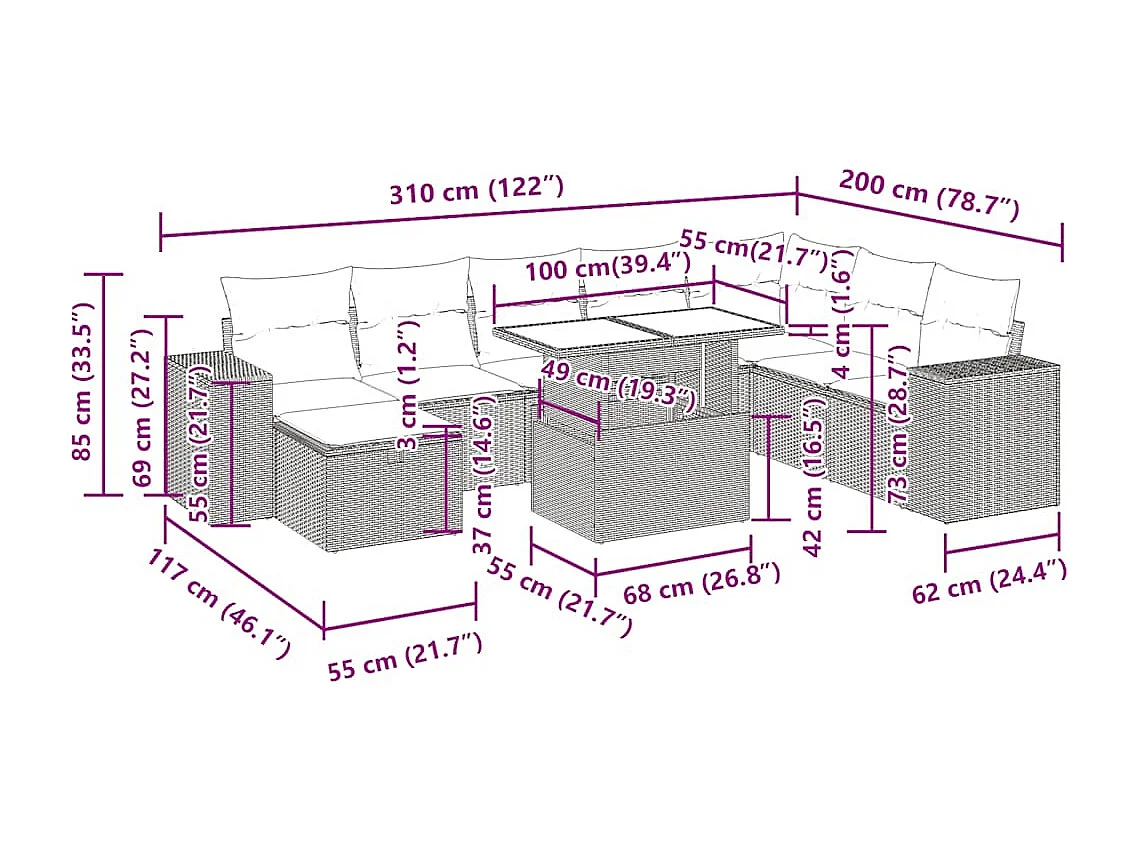 Salon de jardin 9 pcs avec coussins gris clair résine tressée