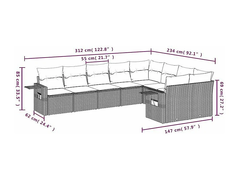 Salon de jardin 9 pcs avec coussins gris clair résine tressée