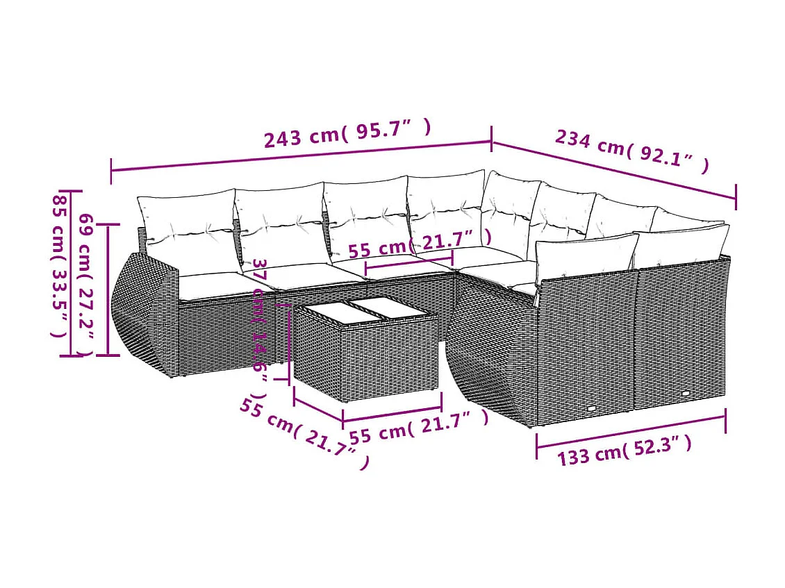 Salon de jardin 9 pcs avec coussins gris résine tressée