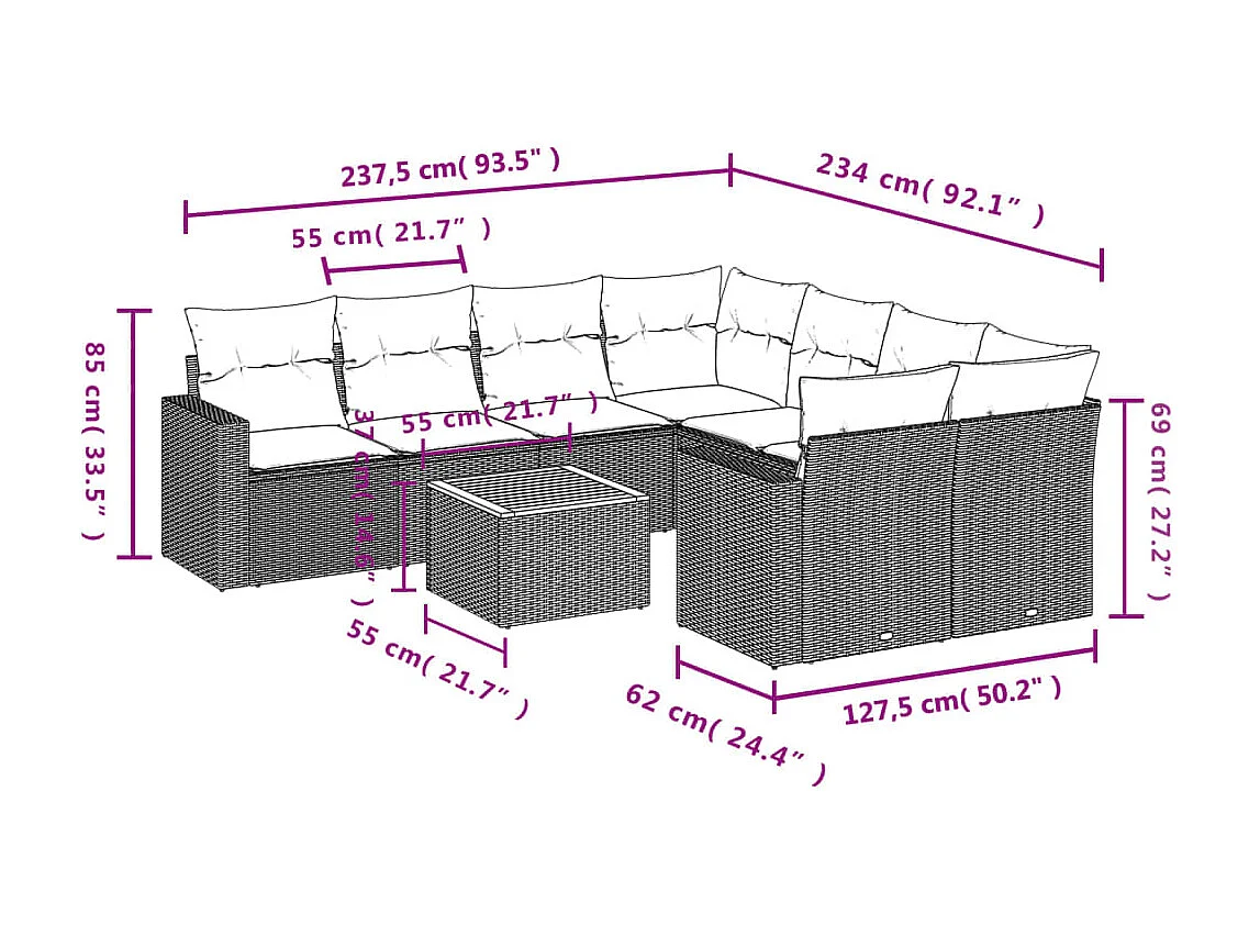 Salon de jardin 9 pcs avec coussins gris résine tressée