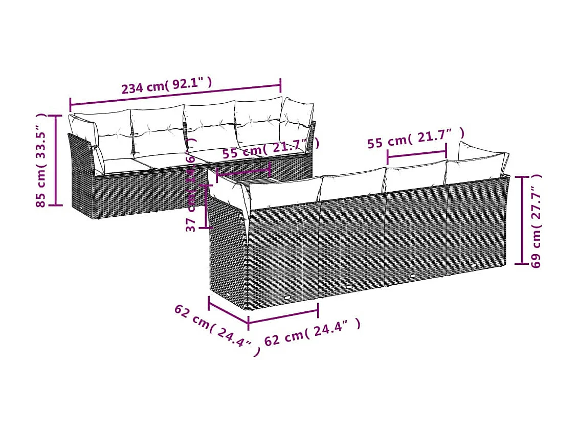 Salon de jardin 9 pcs avec coussins gris résine tressée