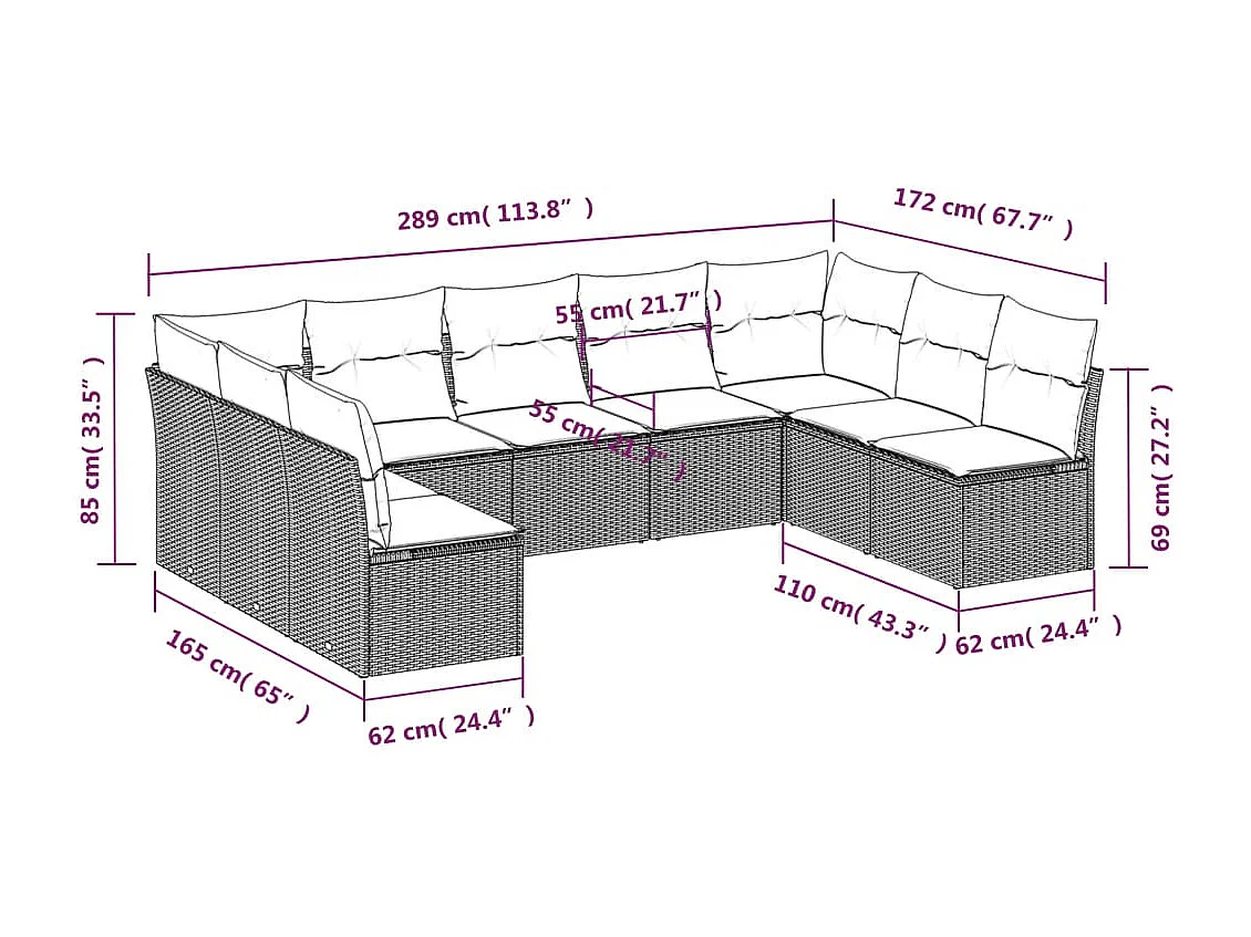 Salon de jardin 9 pcs avec coussins noir résine tressée