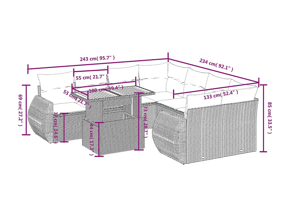 Salon de jardin 9 pcs avec coussins noir résine tressée