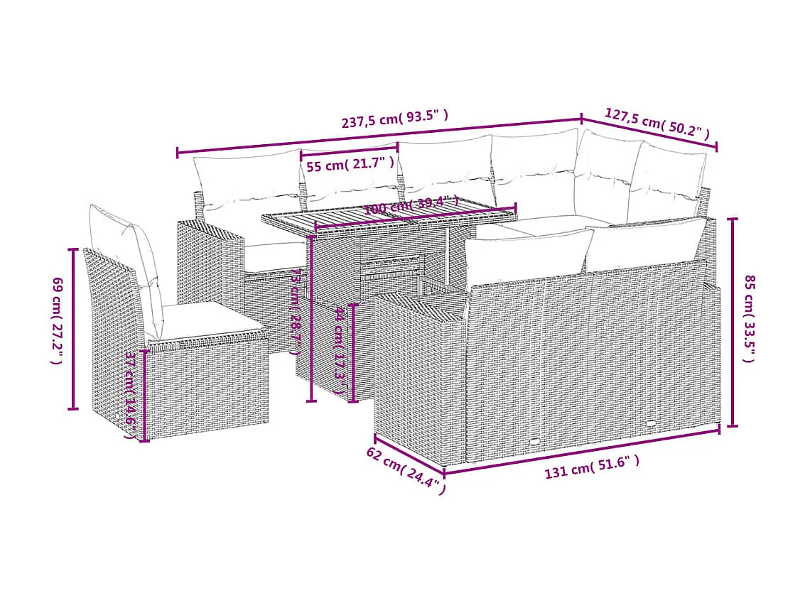 Salon de jardin 9 pcs avec coussins noir résine tressée
