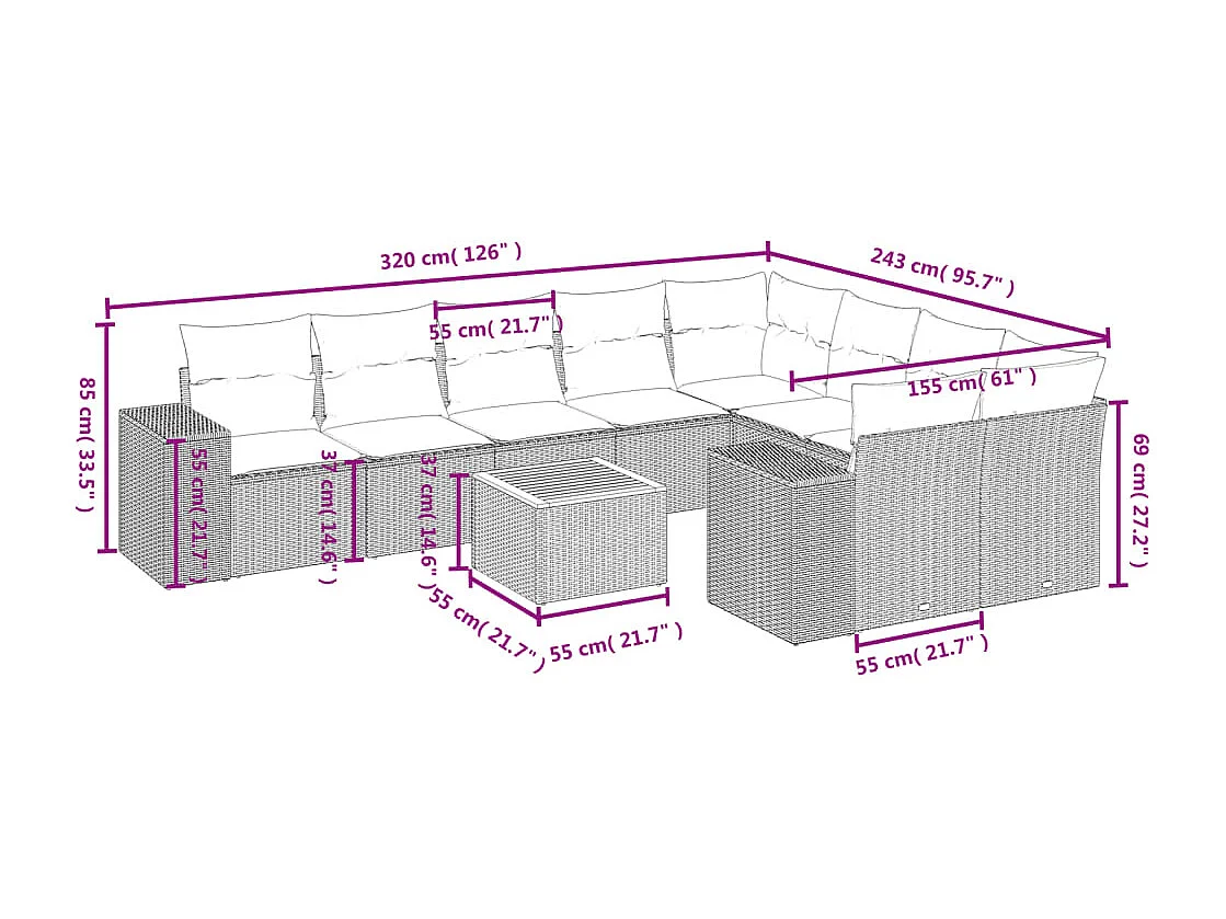 Salon de jardin avec coussins 10 pcs beige résine tressée