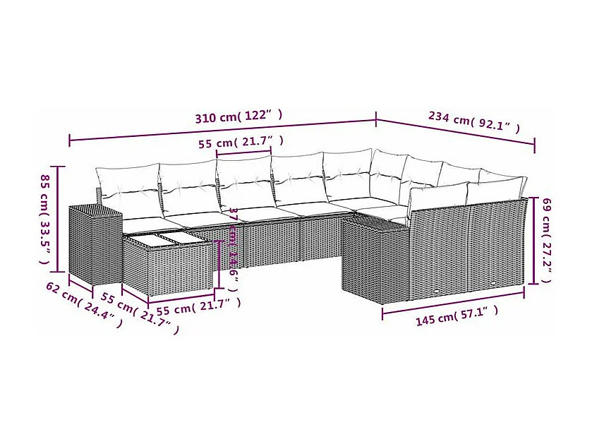 Salon de jardin avec coussins 10 pcs gris clair résine tressée