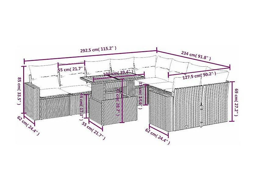 Salon de jardin avec coussins 10 pcs gris résine tressée