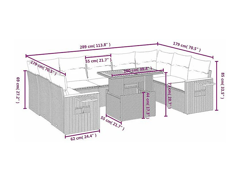 Salon de jardin avec coussins 10 pcs gris résine tressée