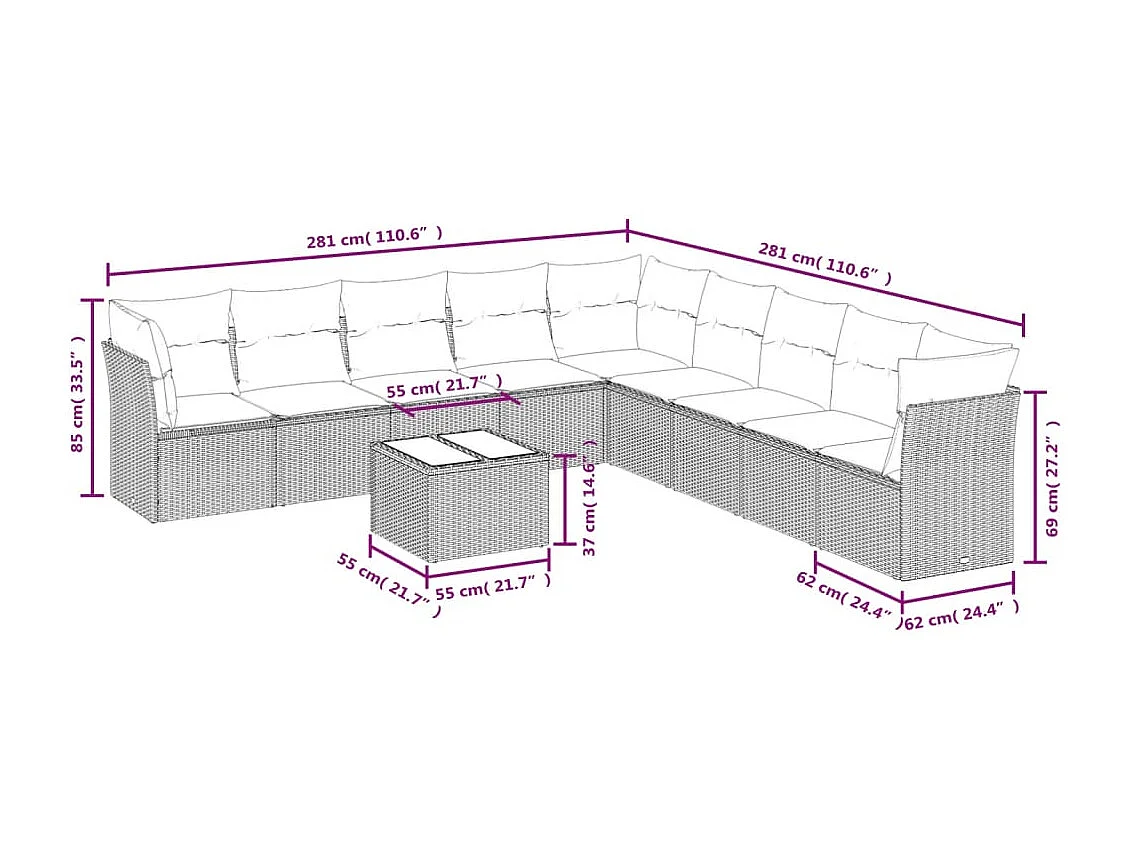 Salon de jardin avec coussins 10 pcs gris résine tressée