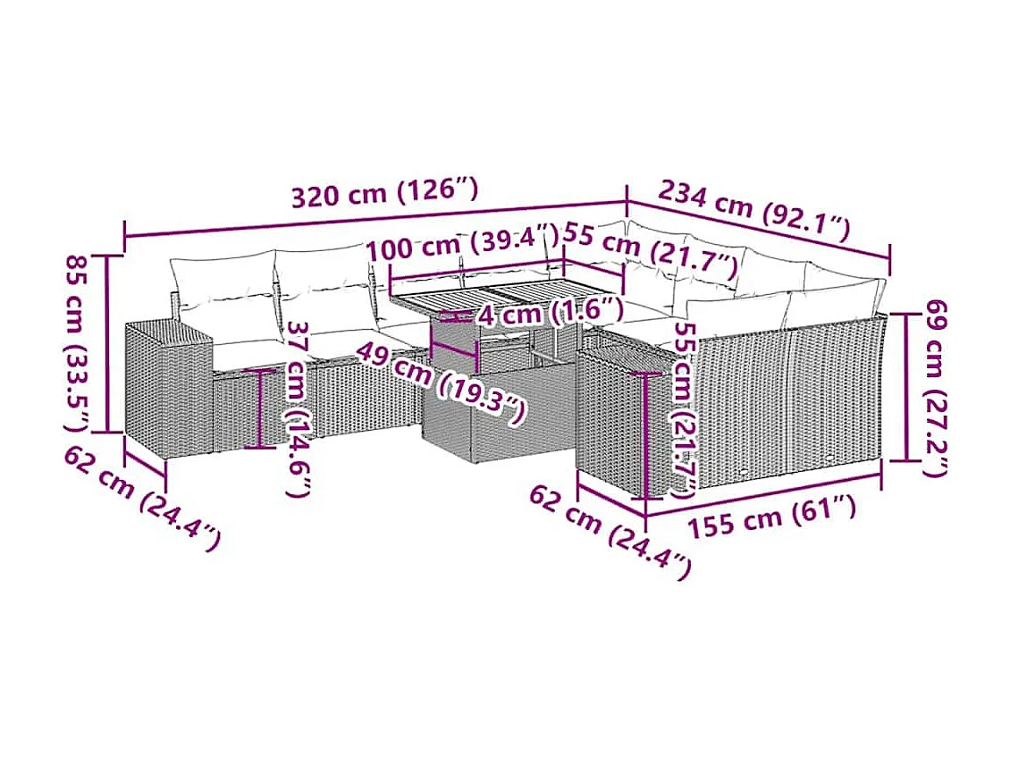 Salon de jardin avec coussins 10pcs beige résine tressée acacia