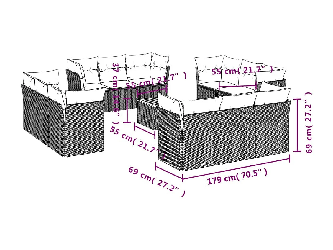 Salon de jardin avec coussins 13 pcs noir résine tressée