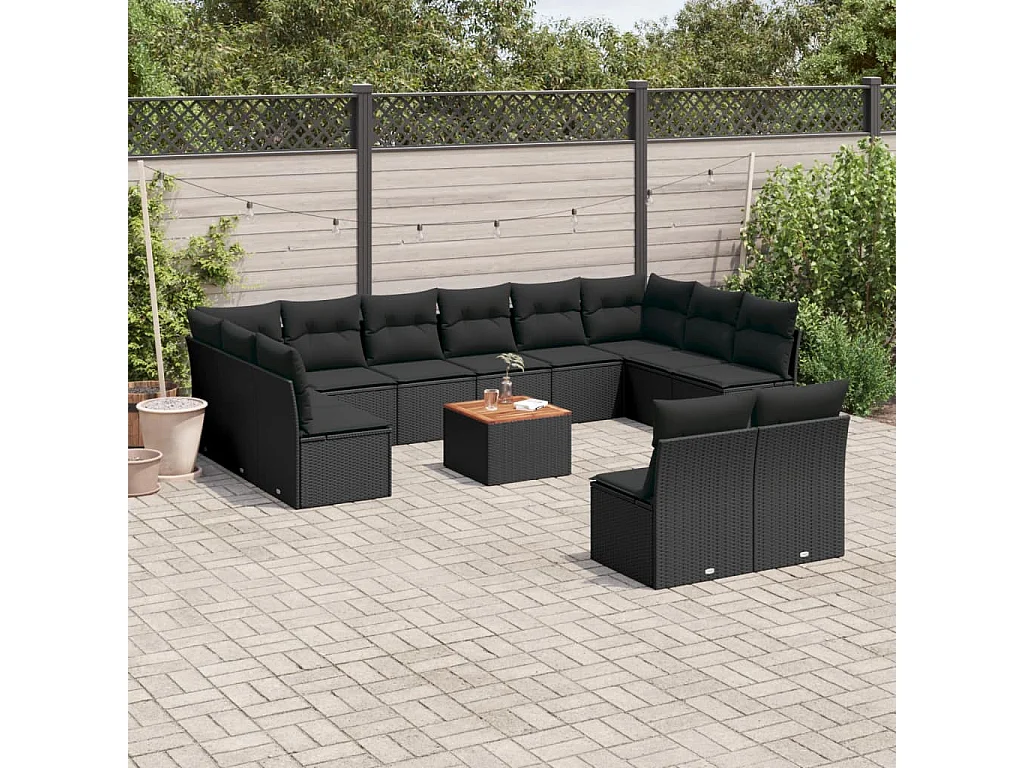 Salon de jardin avec coussins 13 pcs noir résine tressée