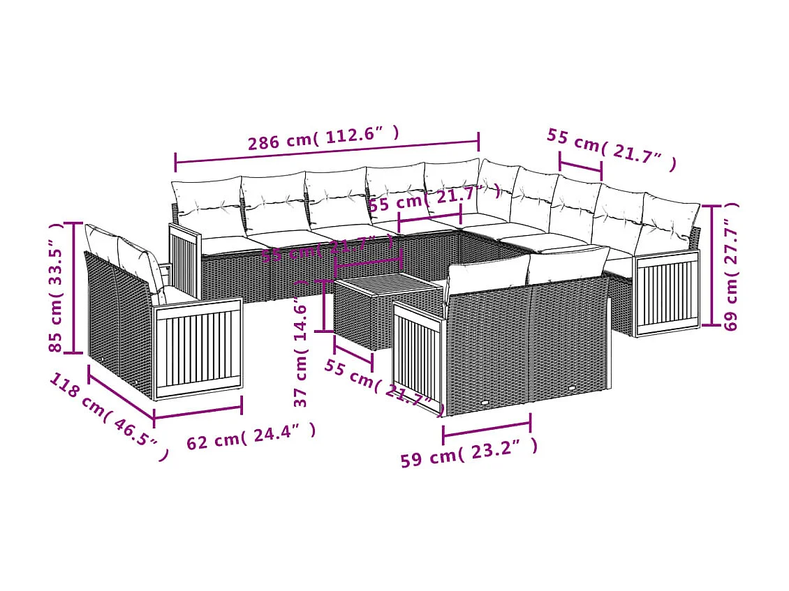 Salon de jardin avec coussins 14 pcs noir résine tressée