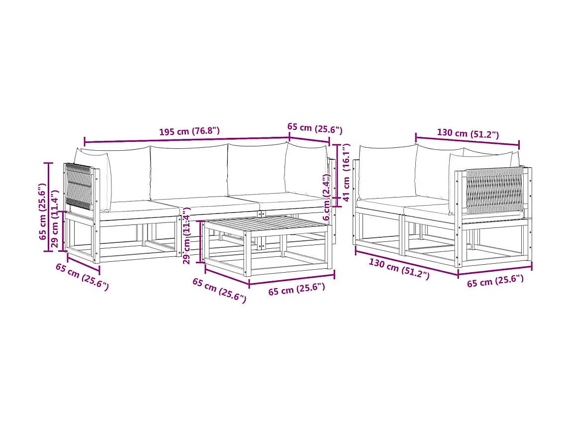 Ensemble de canapés de jardin 6 pièces avec coussins en bois d'acacia et corde
