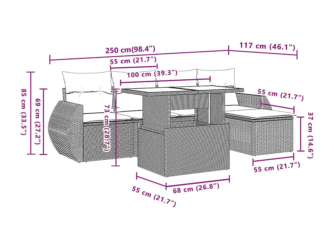 Salon de jardin avec coussins 6 pcs marron résine tressée