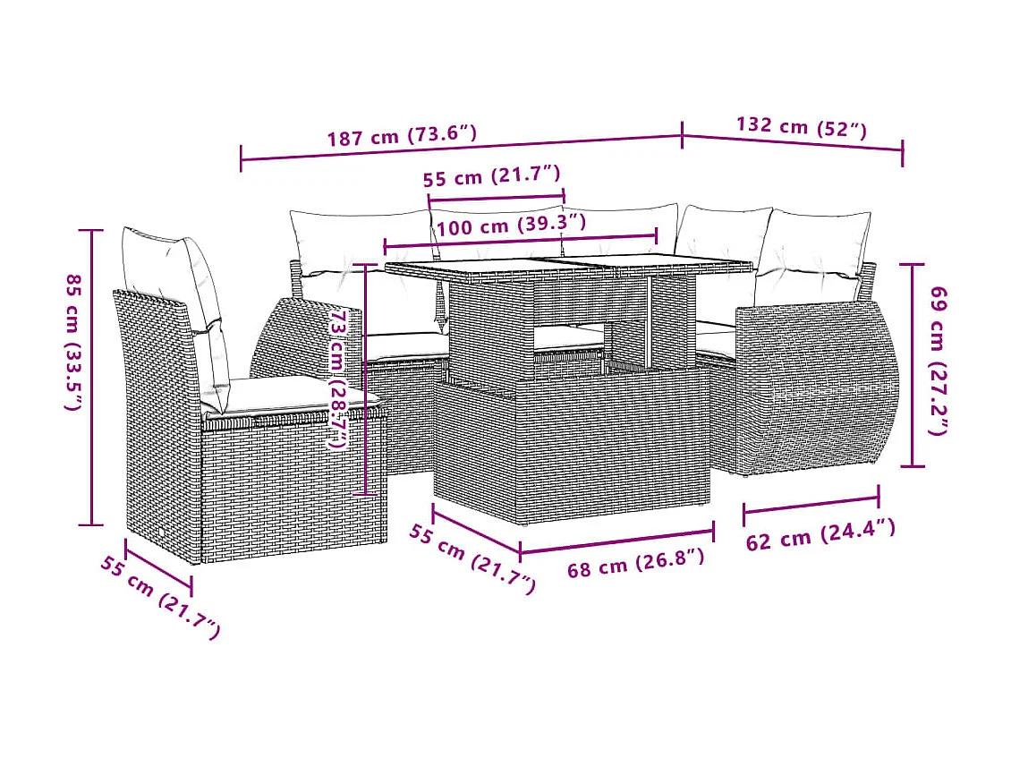 Salon de jardin avec coussins 6 pcs marron résine tressée
