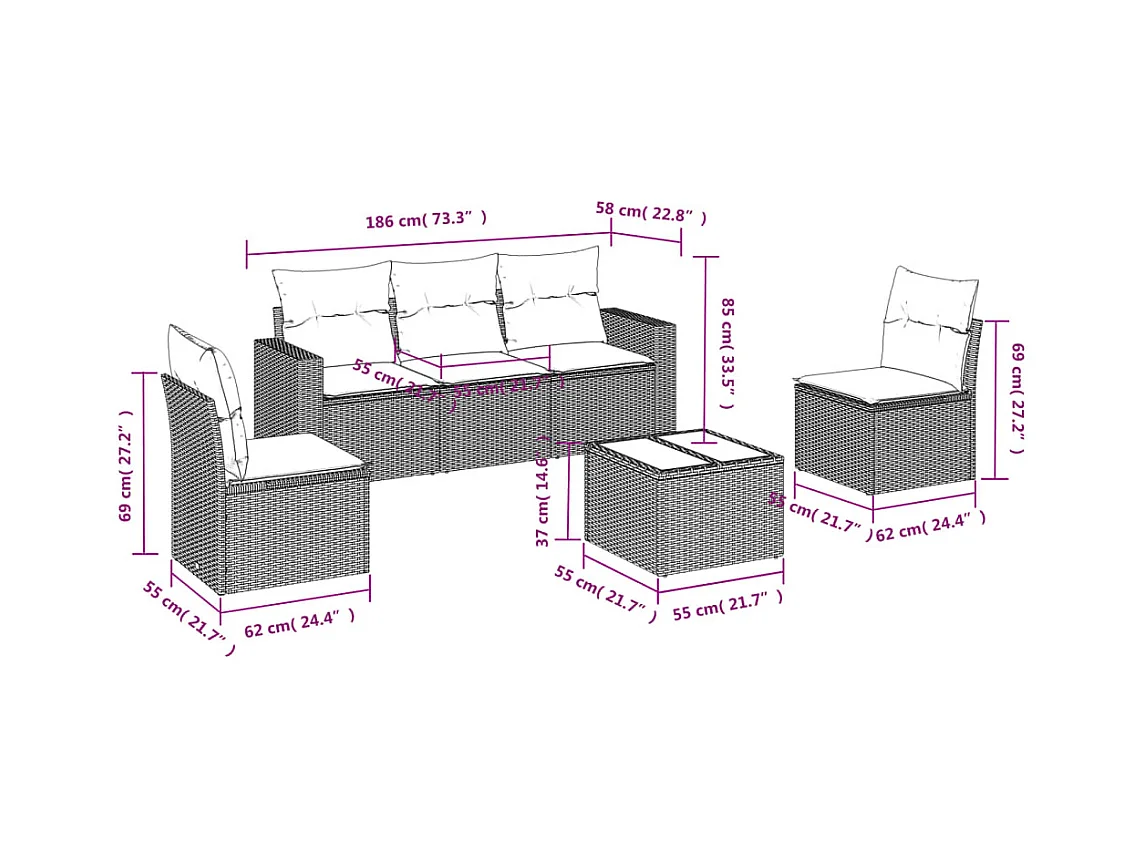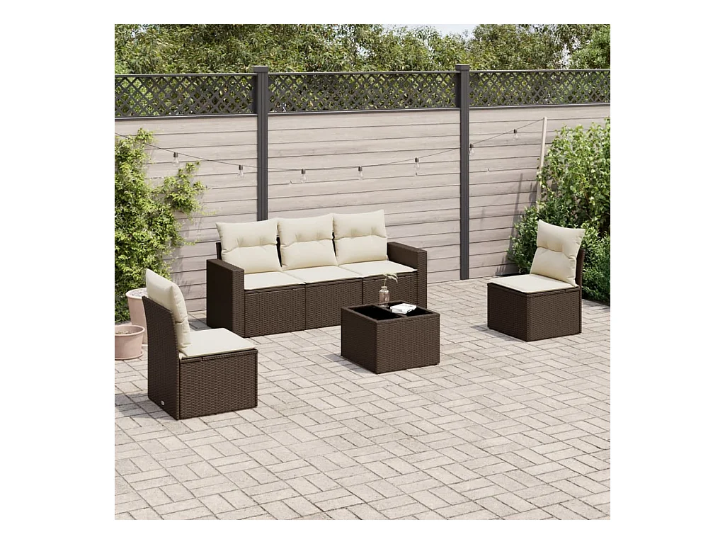 Salon de jardin avec coussins 6 pcs marron résine tressée