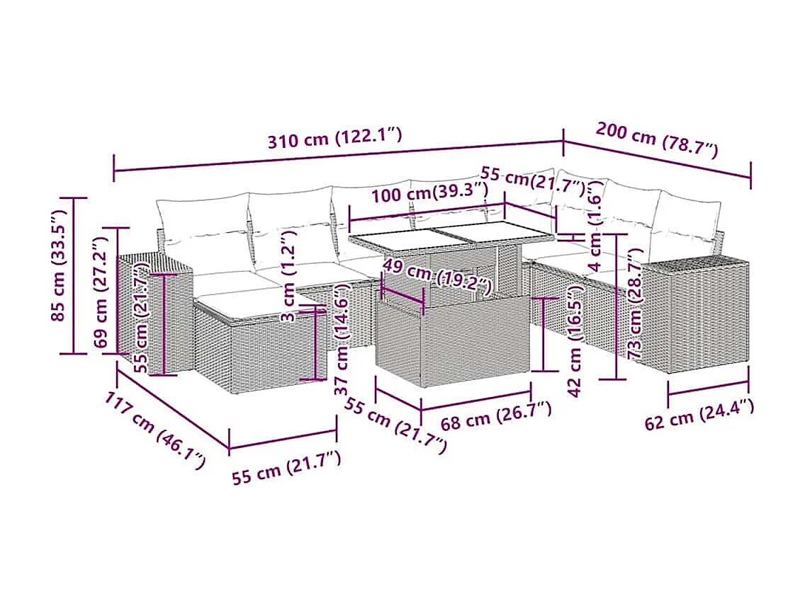 Salon de jardin avec coussins 9 pcs marron résine tressée