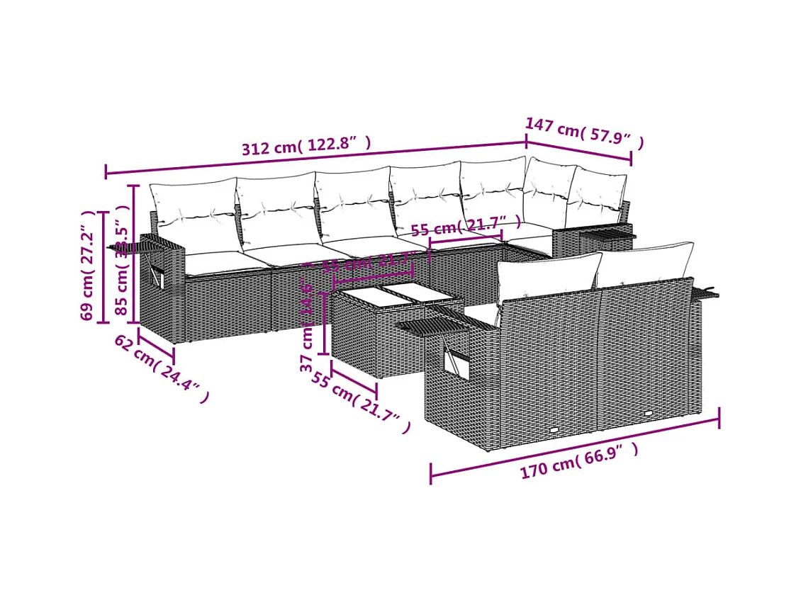 Salon de jardin avec coussins 9 pcs marron résine tressée