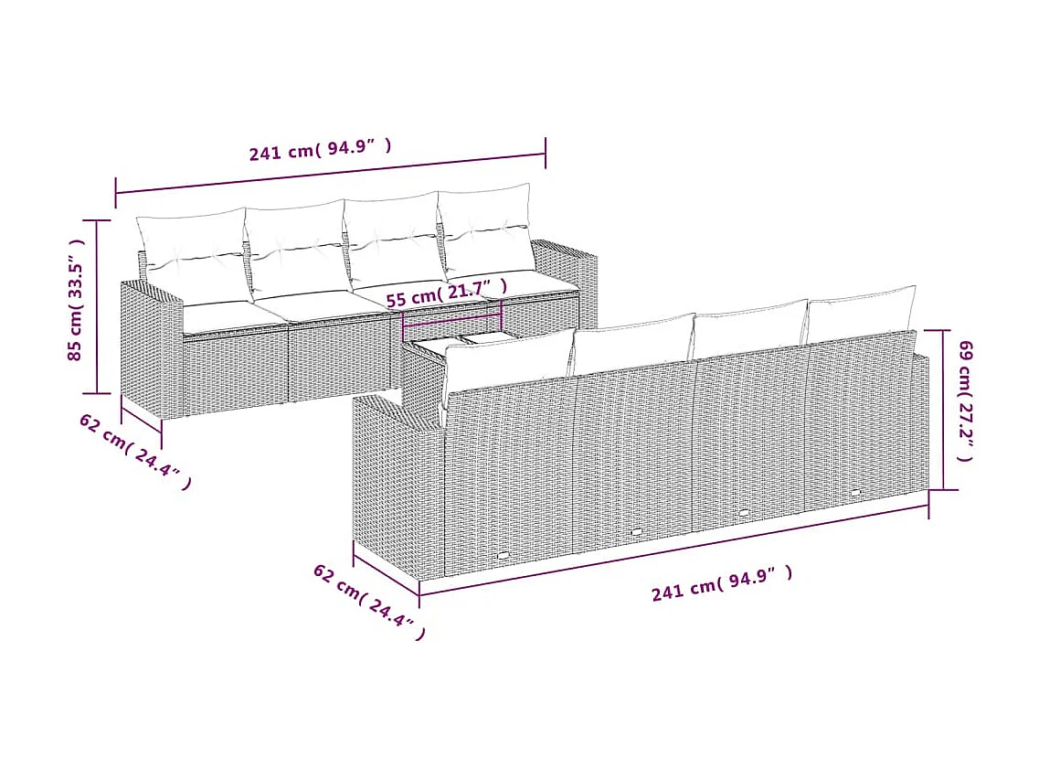 Salon de jardin avec coussins 9 pcs marron résine tressée