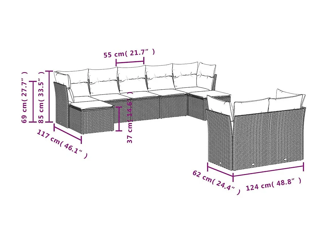 Salon de jardin avec coussins 9 pcs marron résine tressée