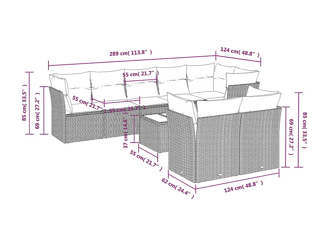 Salon de jardin avec coussins 9 pcs marron résine tressée