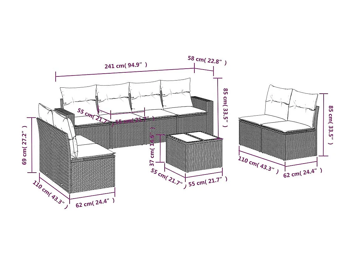Salon de jardin avec coussins 9 pièces marron résine tressée