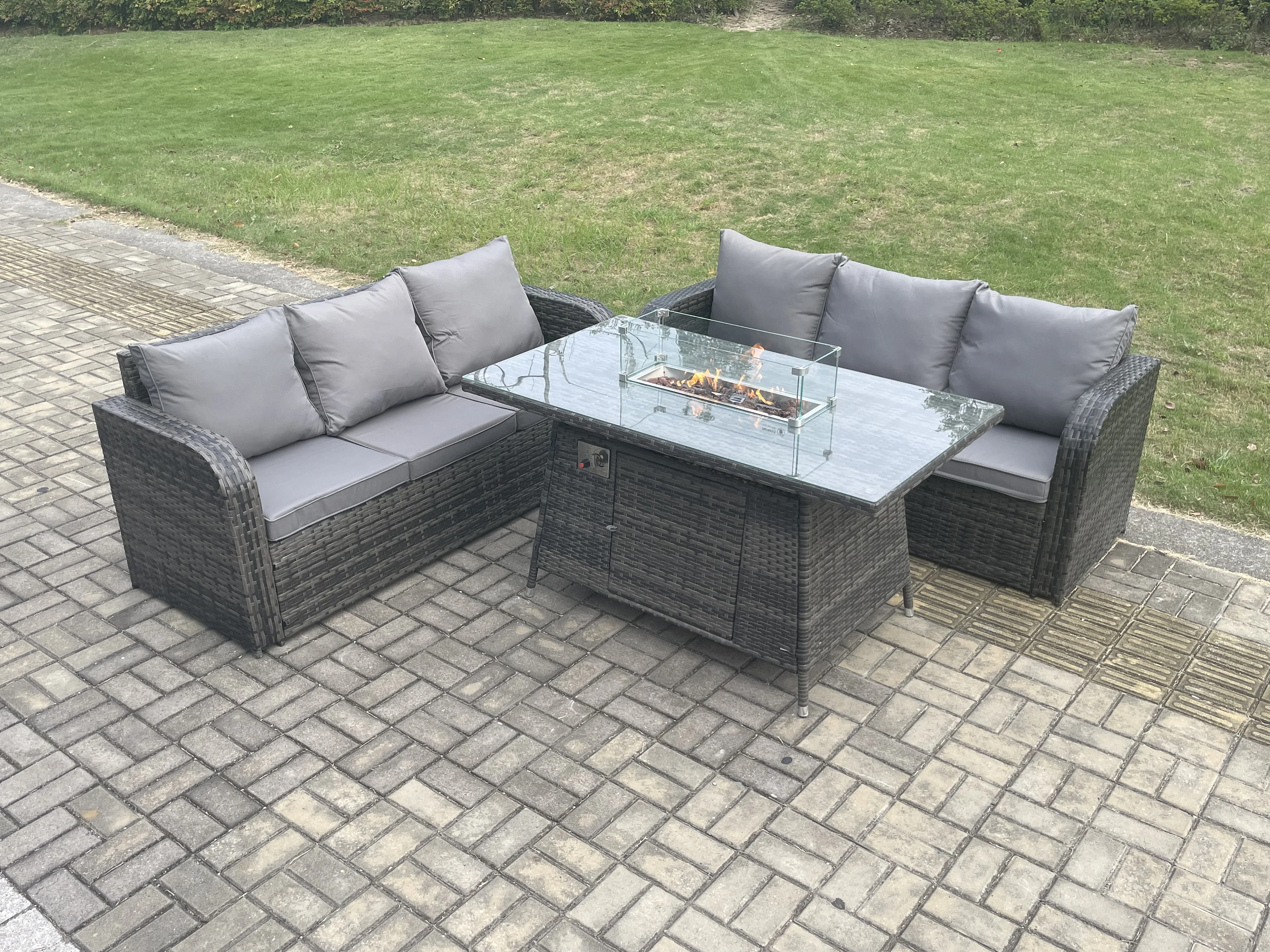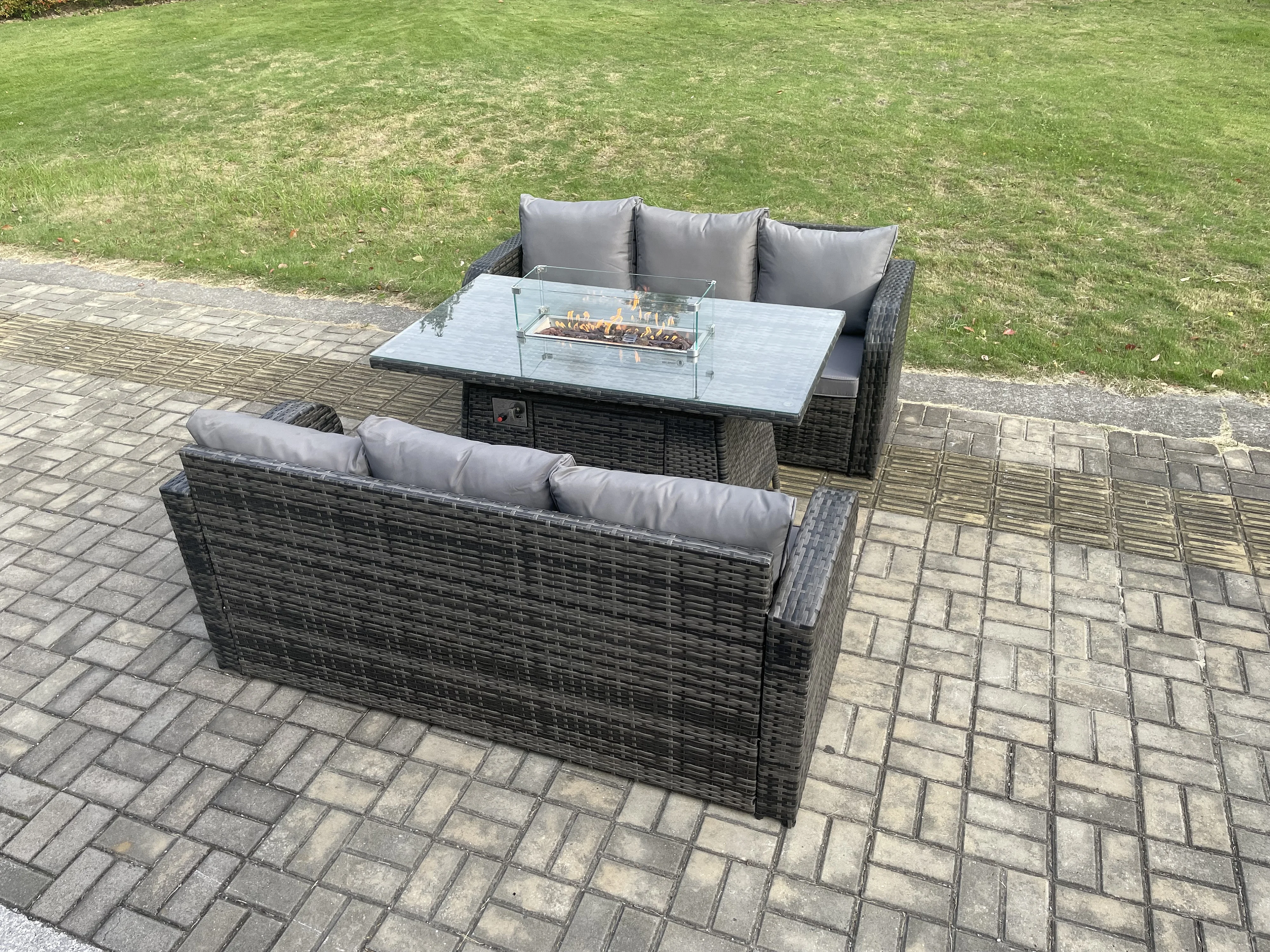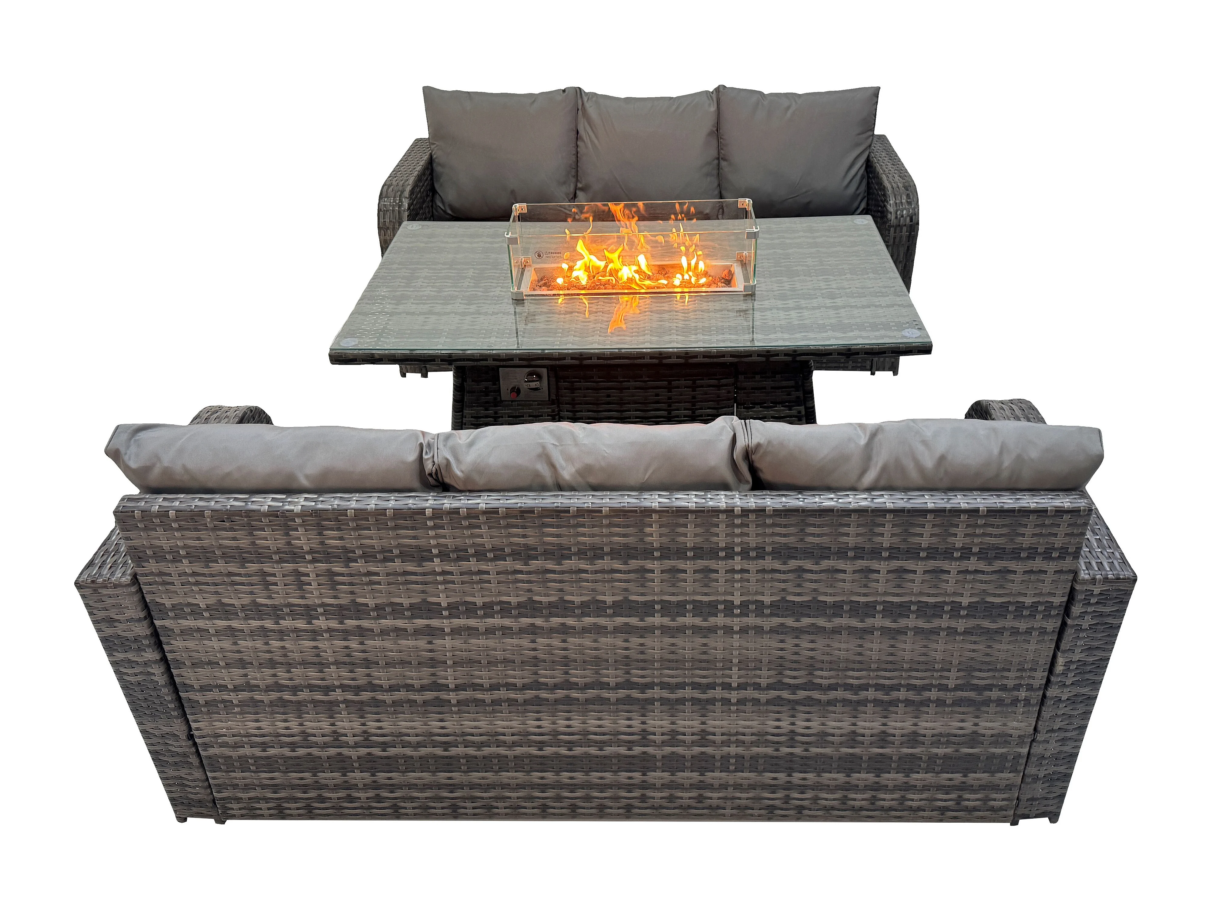 Salon de jardin avec Table de foyer à gaz 3 Pièces Ensemble de canapés en rotin Gris foncé mixte