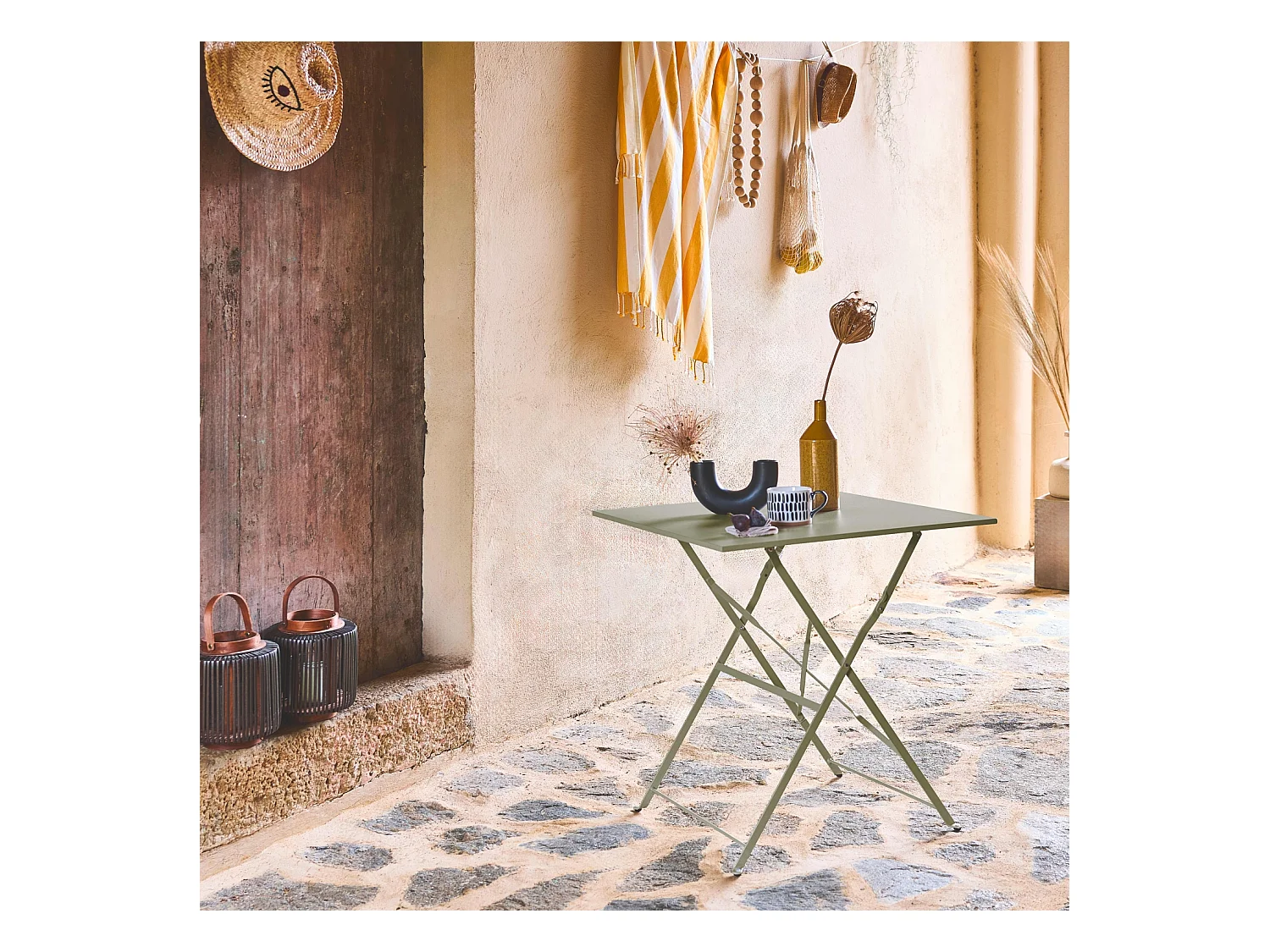 Table de jardin bistrot pliante métal + 2 assises vert de gris 70 x 70cm. acier thermolaqué