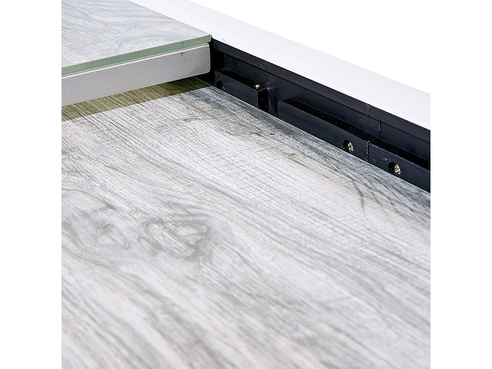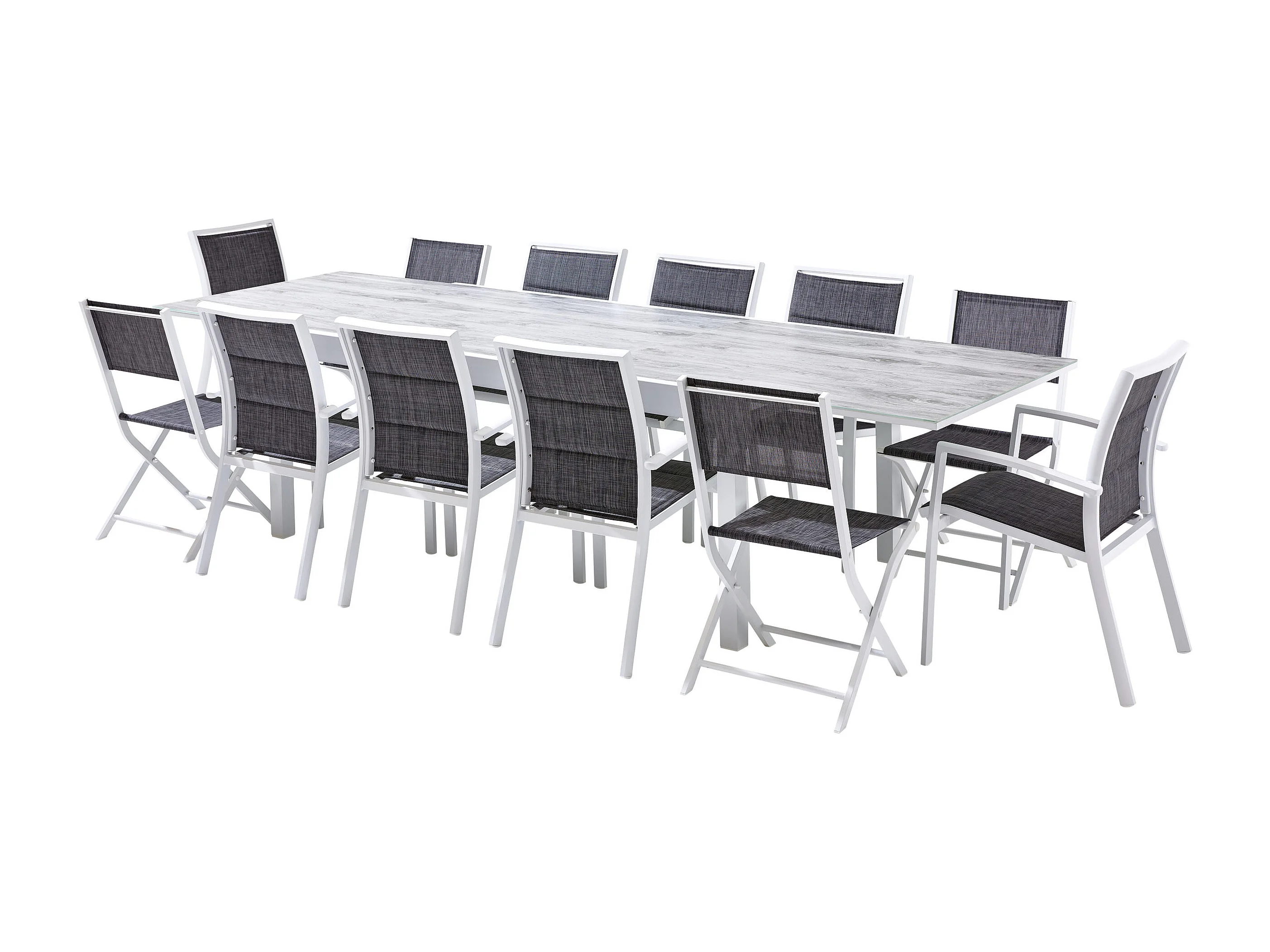 Ensemble MODULO 6/10p en aluminium blanc et verre décors bois avec 10 fauteuils en textilène