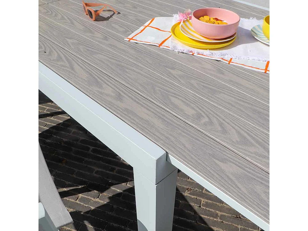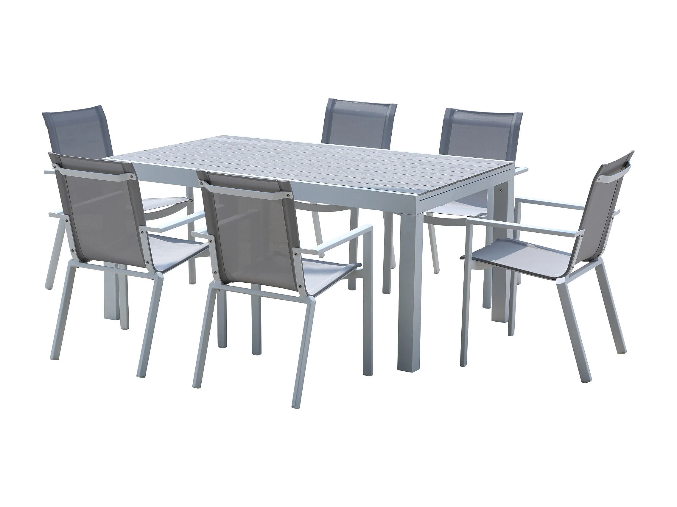Ensemble TULUM 6/10p en aluminium blanc et plateau en aluminium décors bois avec 6 fauteuils en textilène