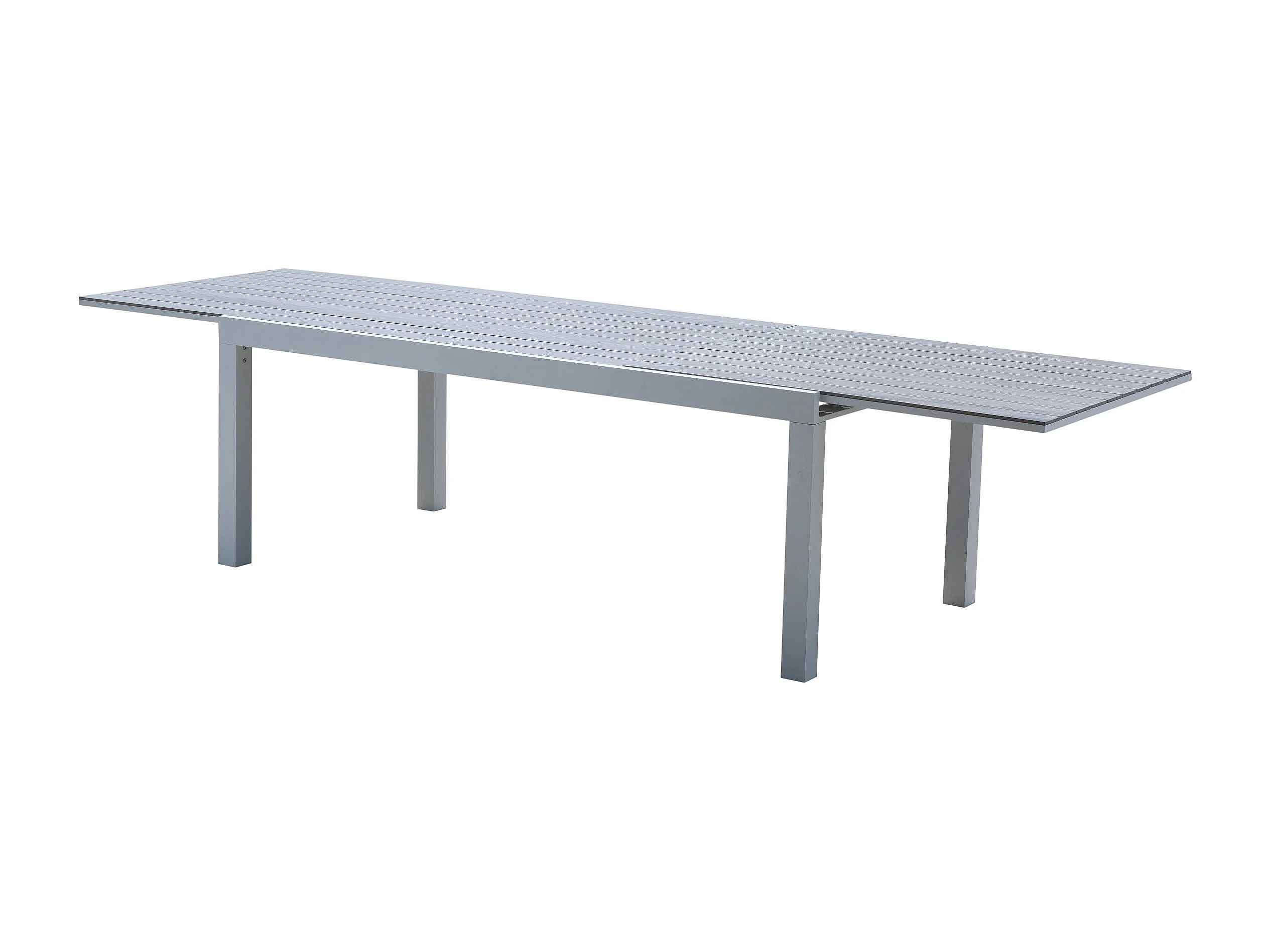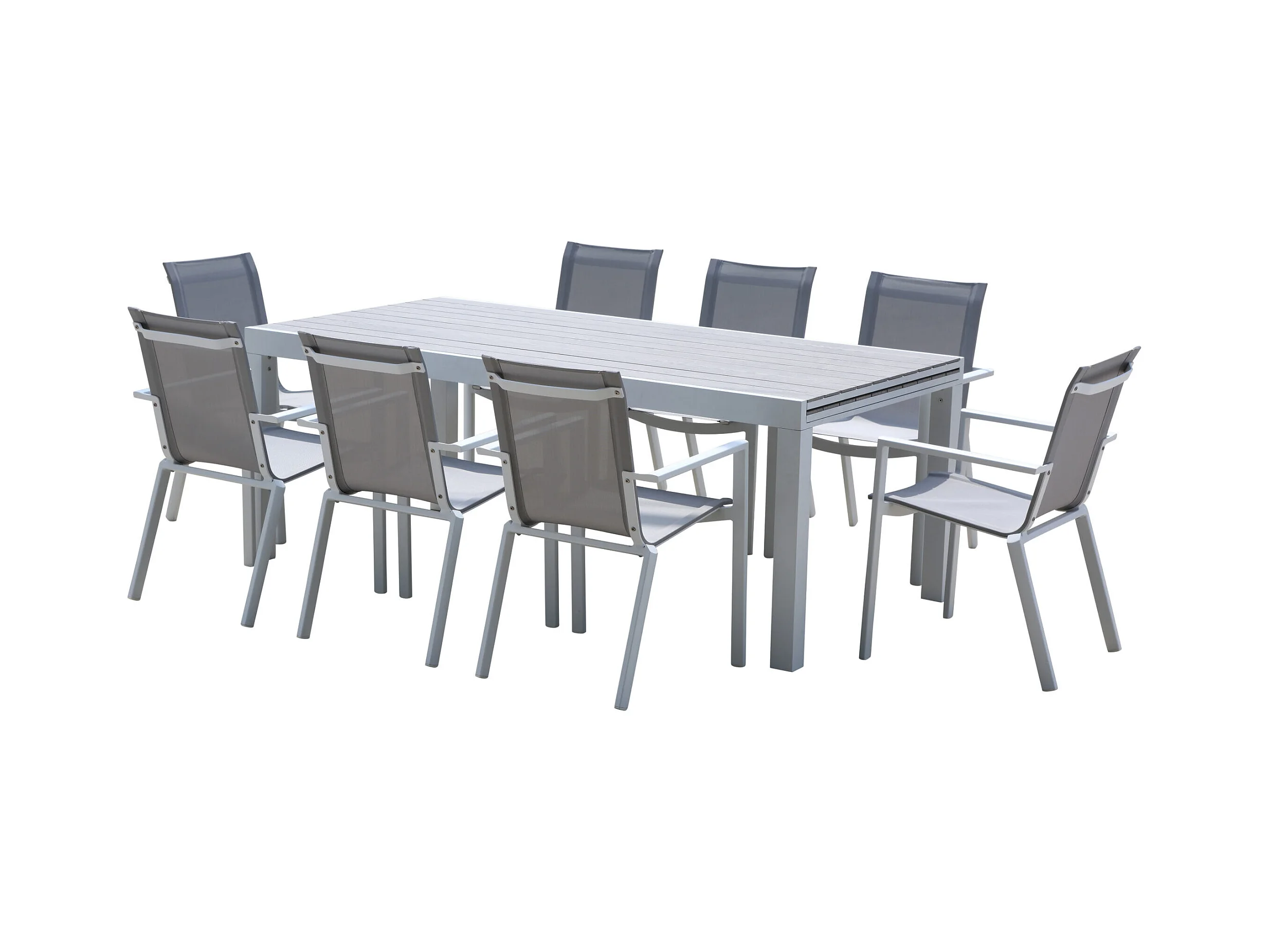 Ensemble TULUM 8/12p en aluminium blanc et plateau en aluminium décors bois avec 8 fauteuils en textilène