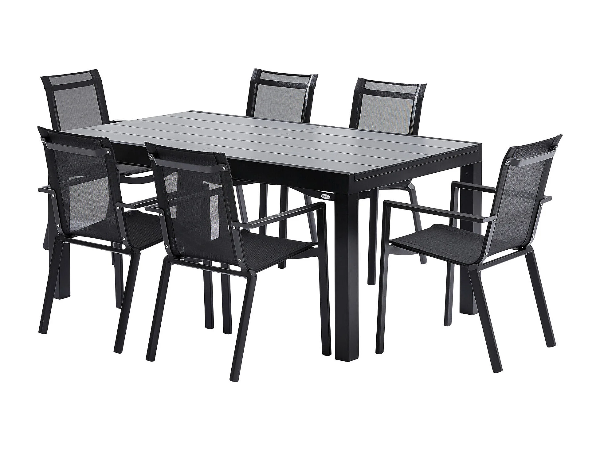 Ensemble HPL 6/10p en aluminium noir et plateau en HPL gris avec 6 fauteuils en textilène