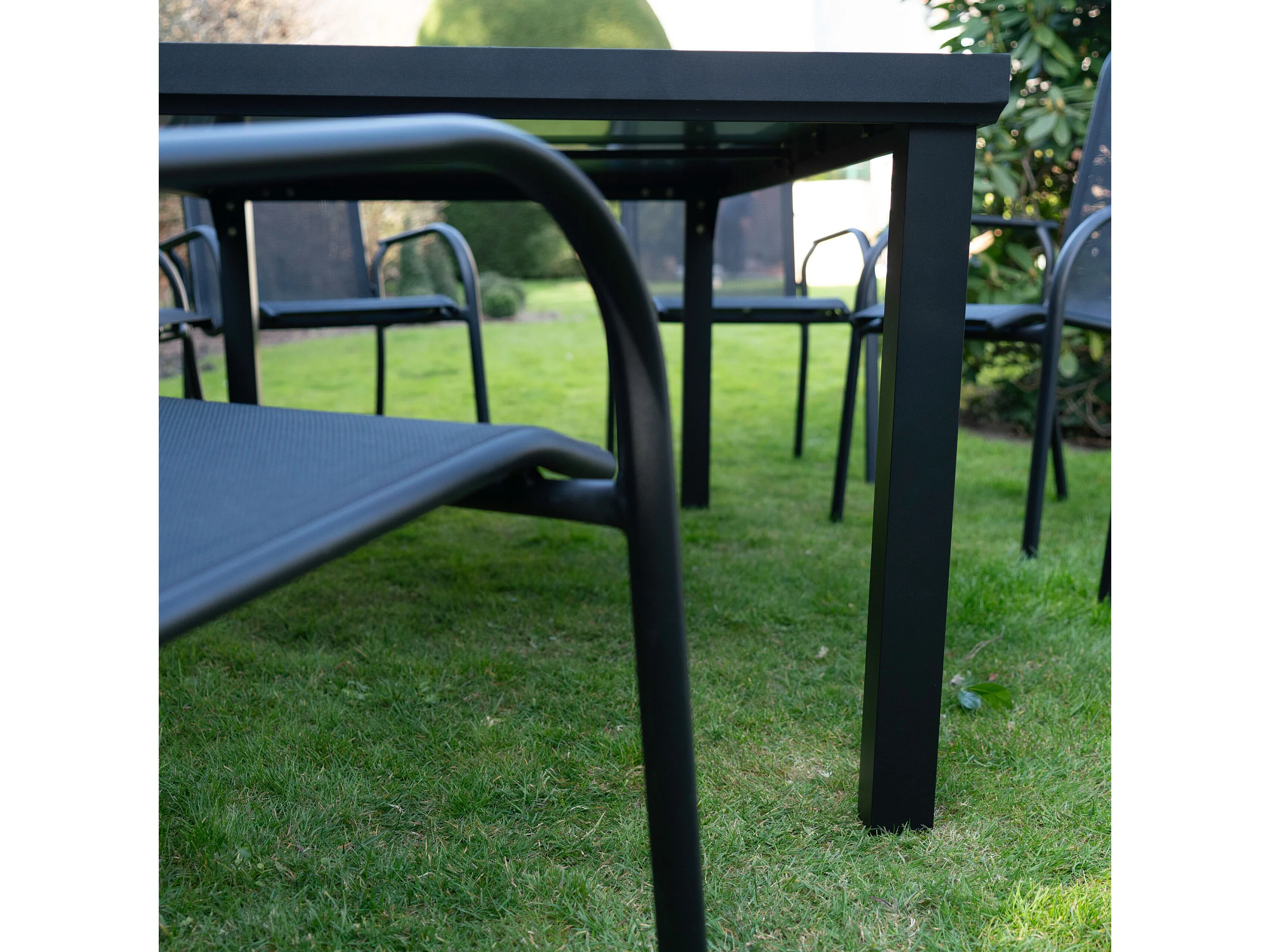 Ensemble BLACKEDITION 8p en aluminium, plateau en verre trempé opaque avec 8 fauteuils en textilène
