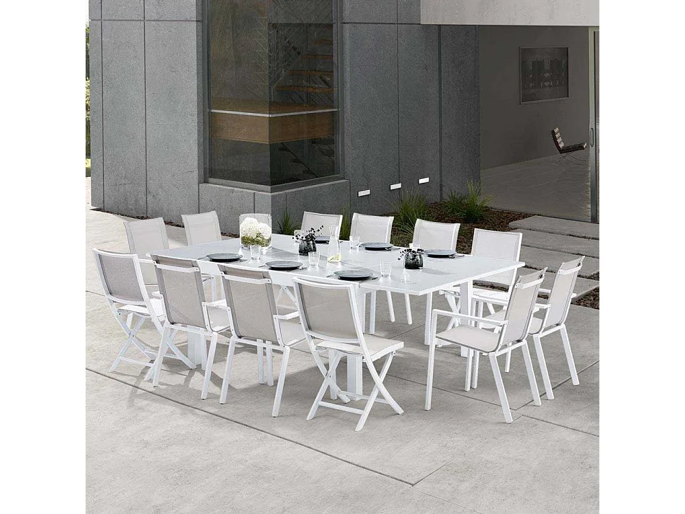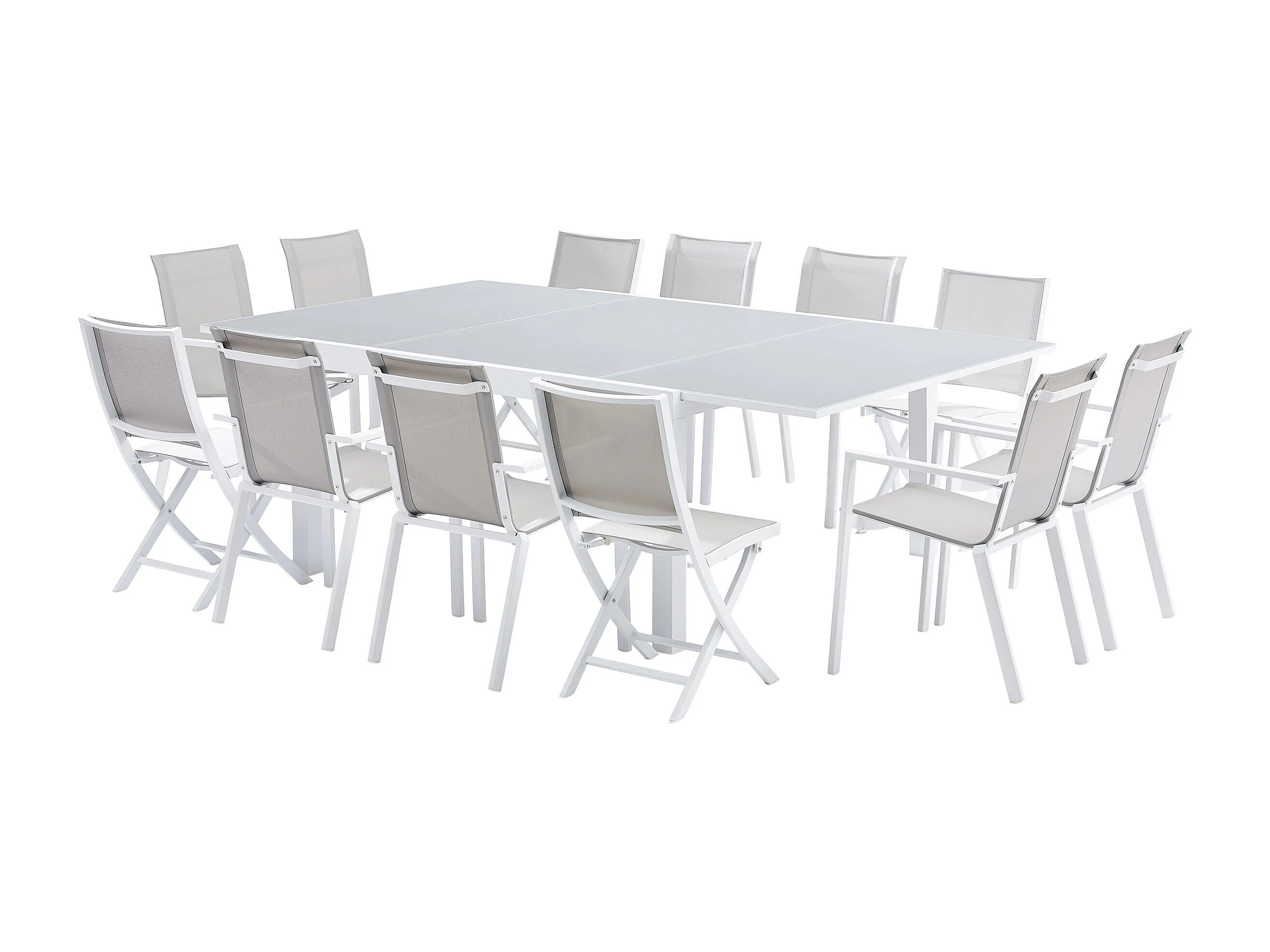 Ensemble WHITESTAR 8/12p en aluminium blanc et verre blanc avec 8 fauteuils et 4 chaises pliantes en aluminium et textilène
