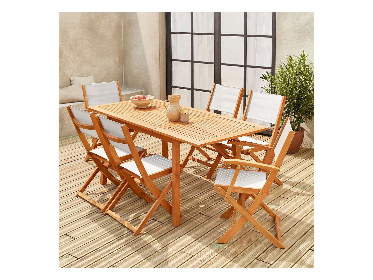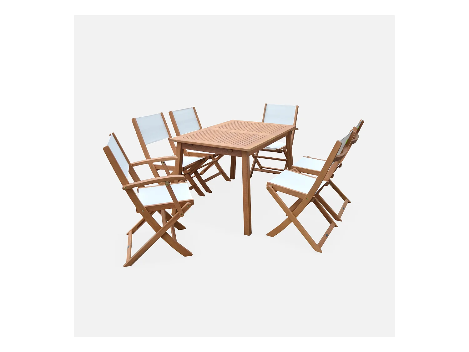 Salon de jardin en bois extensible - Almeria - Table 120/180cm avec rallonge. 2 fauteuils et 4 chaises. en bois d'Eucalyptus huilé et textilène blanc