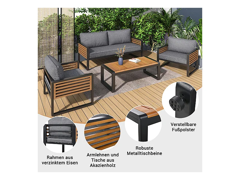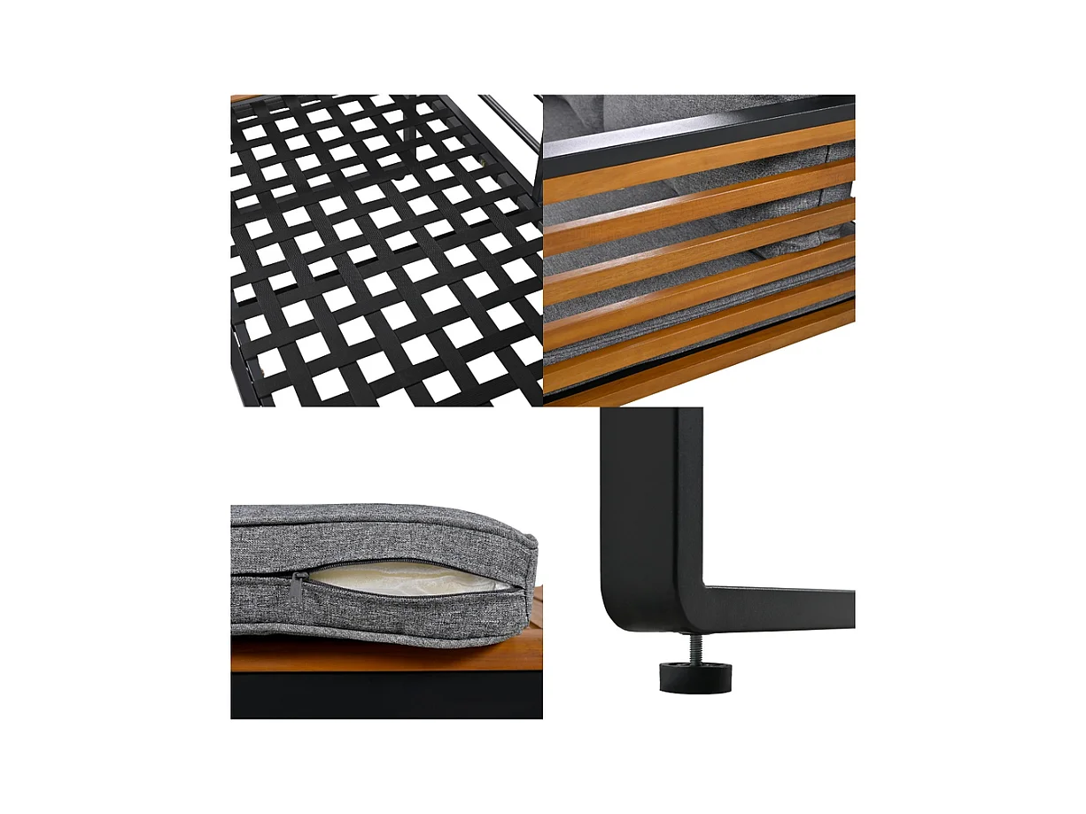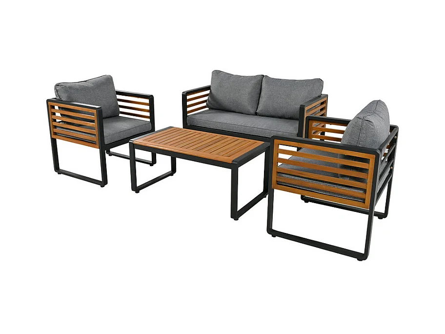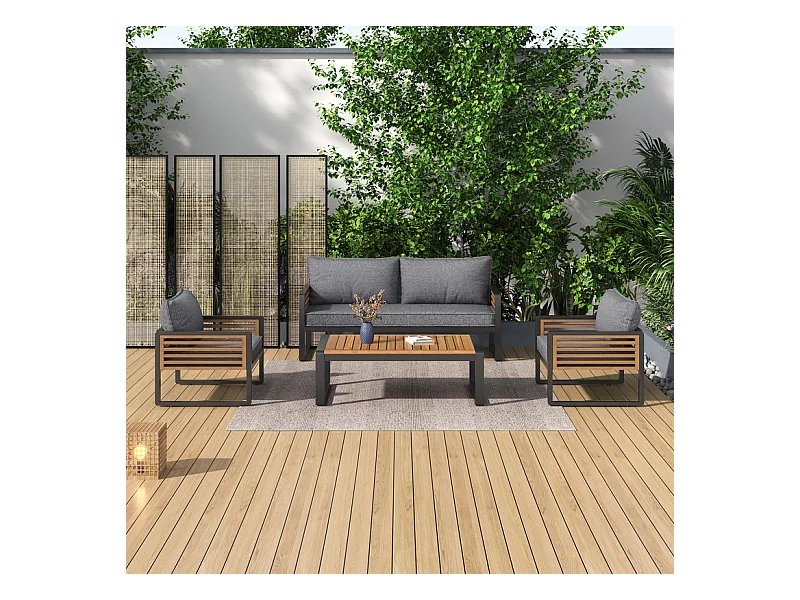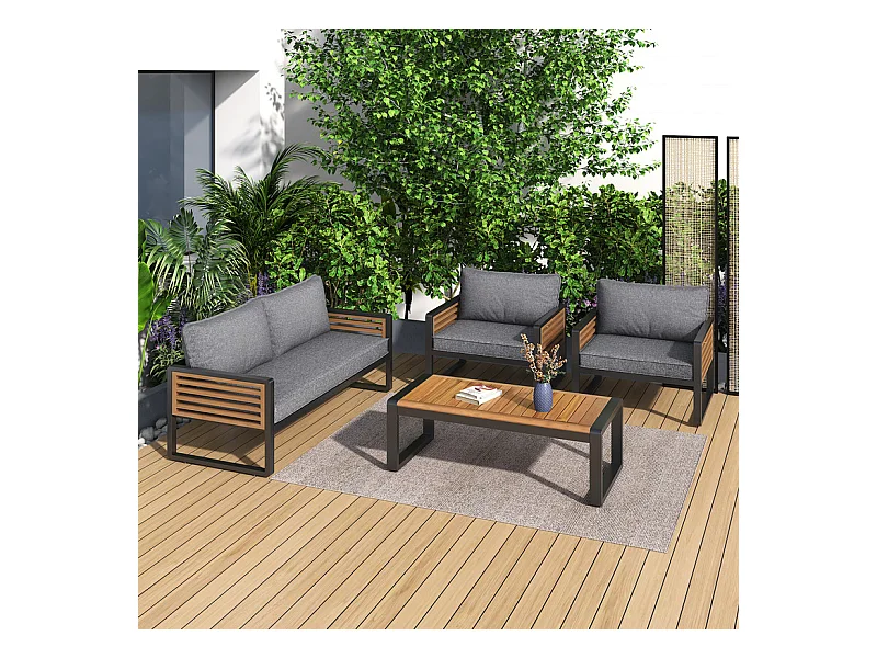 Salon de jardin en Fer 4 personnes - 1 canapé、2 fauteuils et 1 table basse - décoré de Bois d'Acacia - Gris