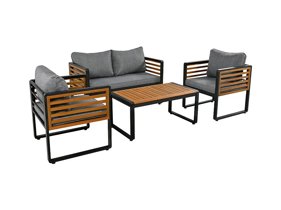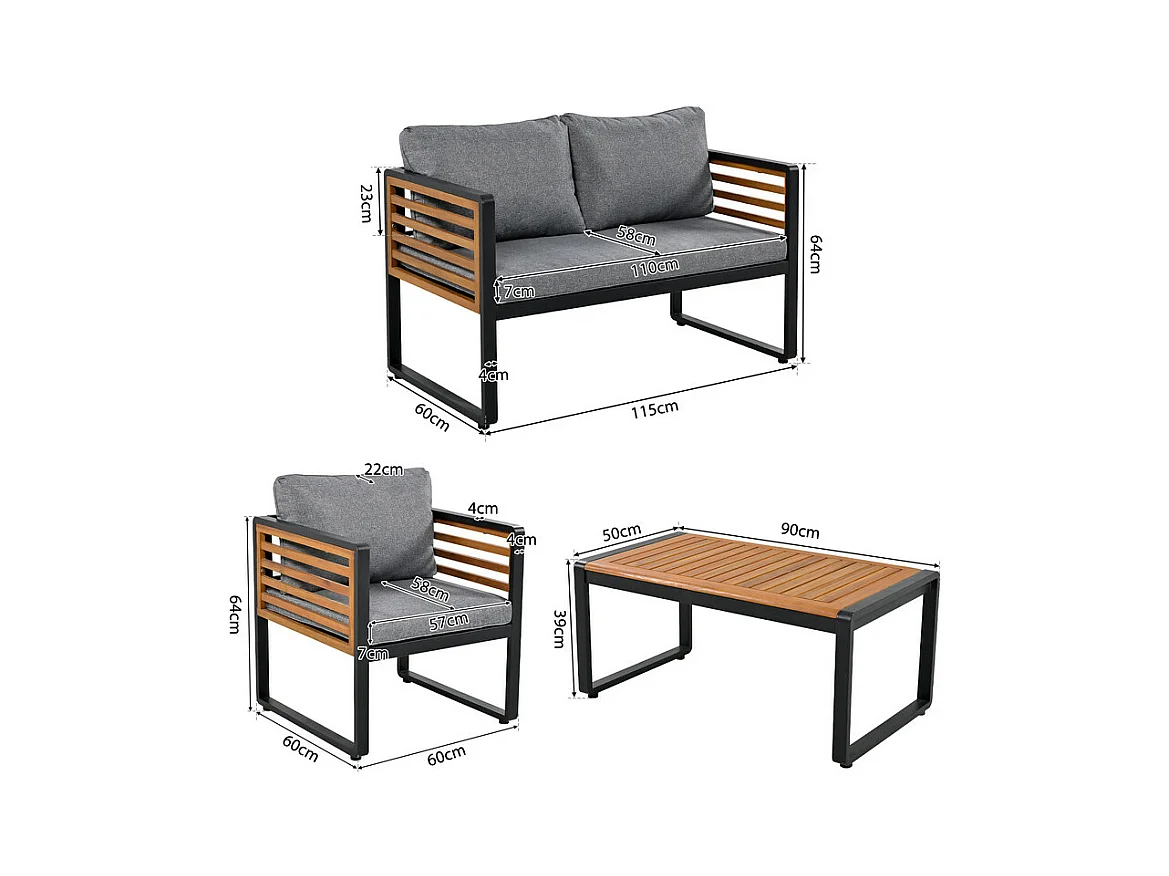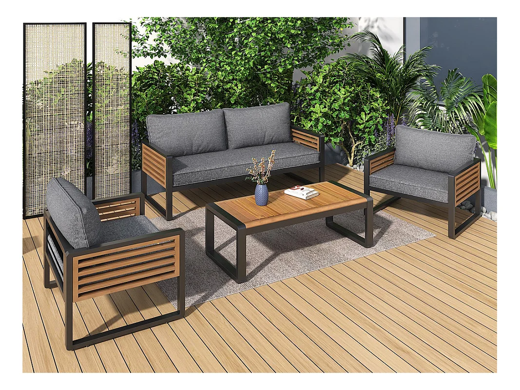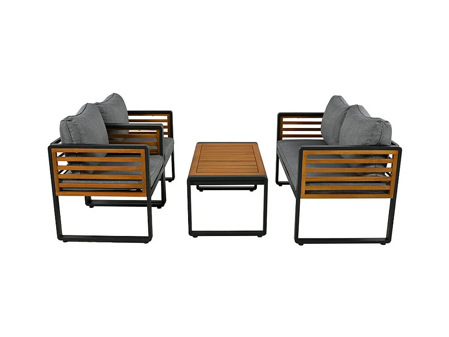 Salon de jardin en Fer 4 personnes - 1 canapé、2 fauteuils et 1 table basse - décoré de Bois d'Acacia - Gris