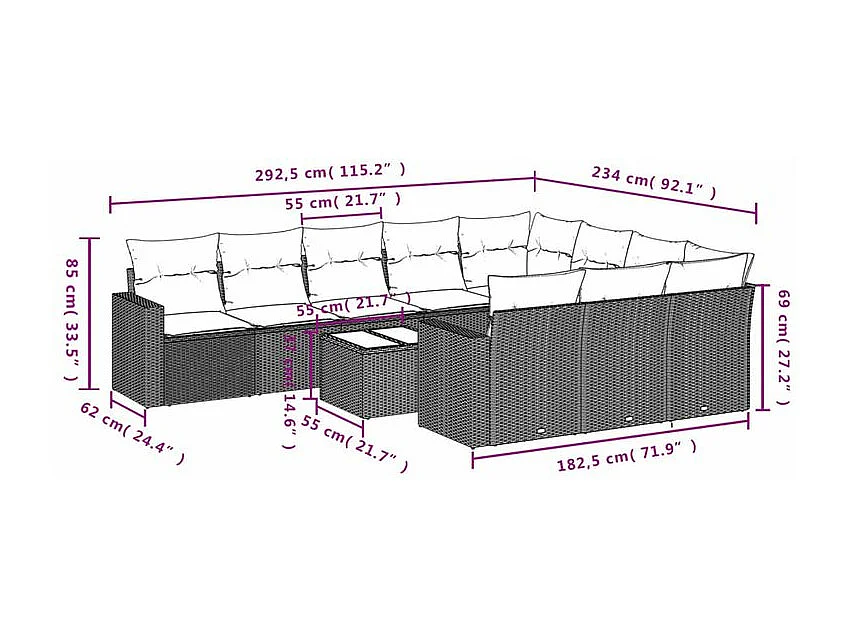 Salon de jardin et coussins 11 pcs marron résine tressée