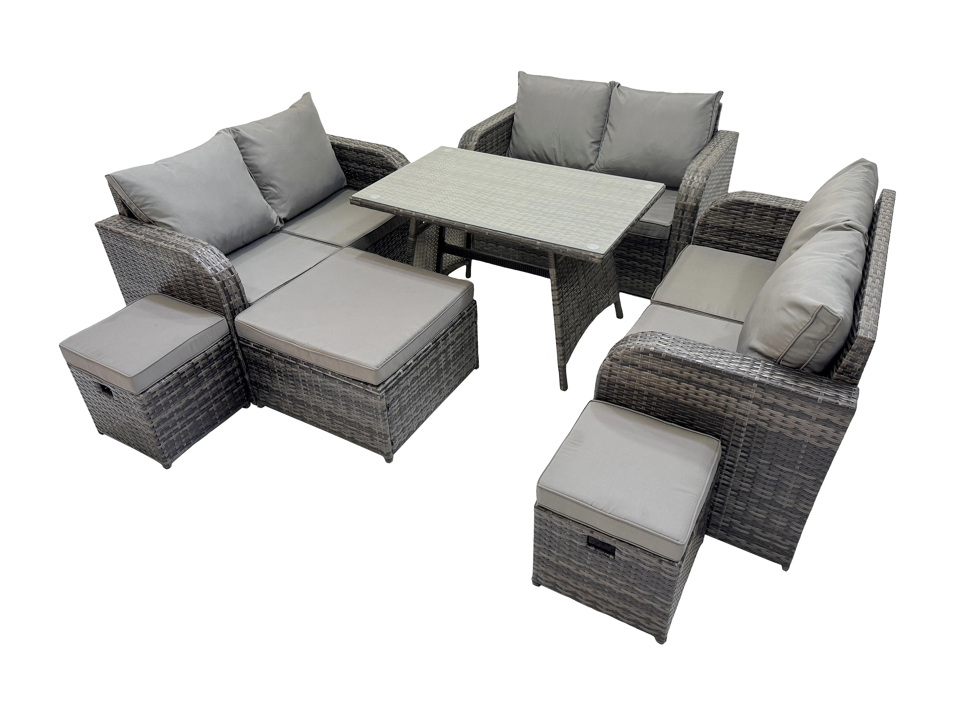 Salon de jardin exterieur 9 places avec Canapé d'amour Table à manger rectangulaire 3 Tabourets Gris foncé mixte