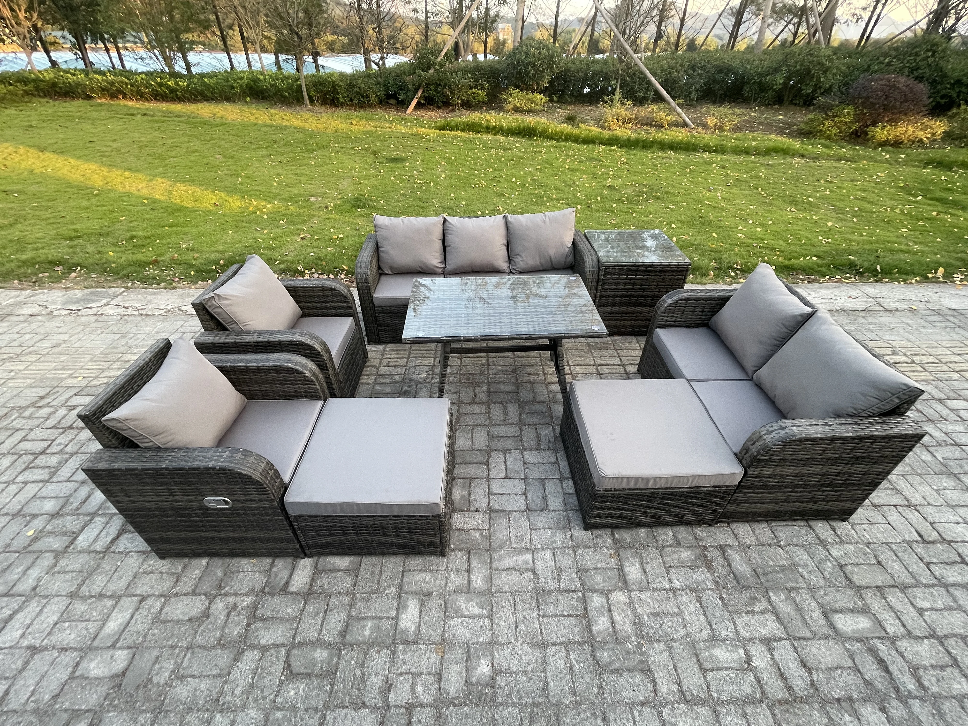 Salon de jardin exterieur 9 places Ensemble de canapés en rotin avec Table à manger 2 Grand tabourets Table d'appoint Gris foncé mixte
