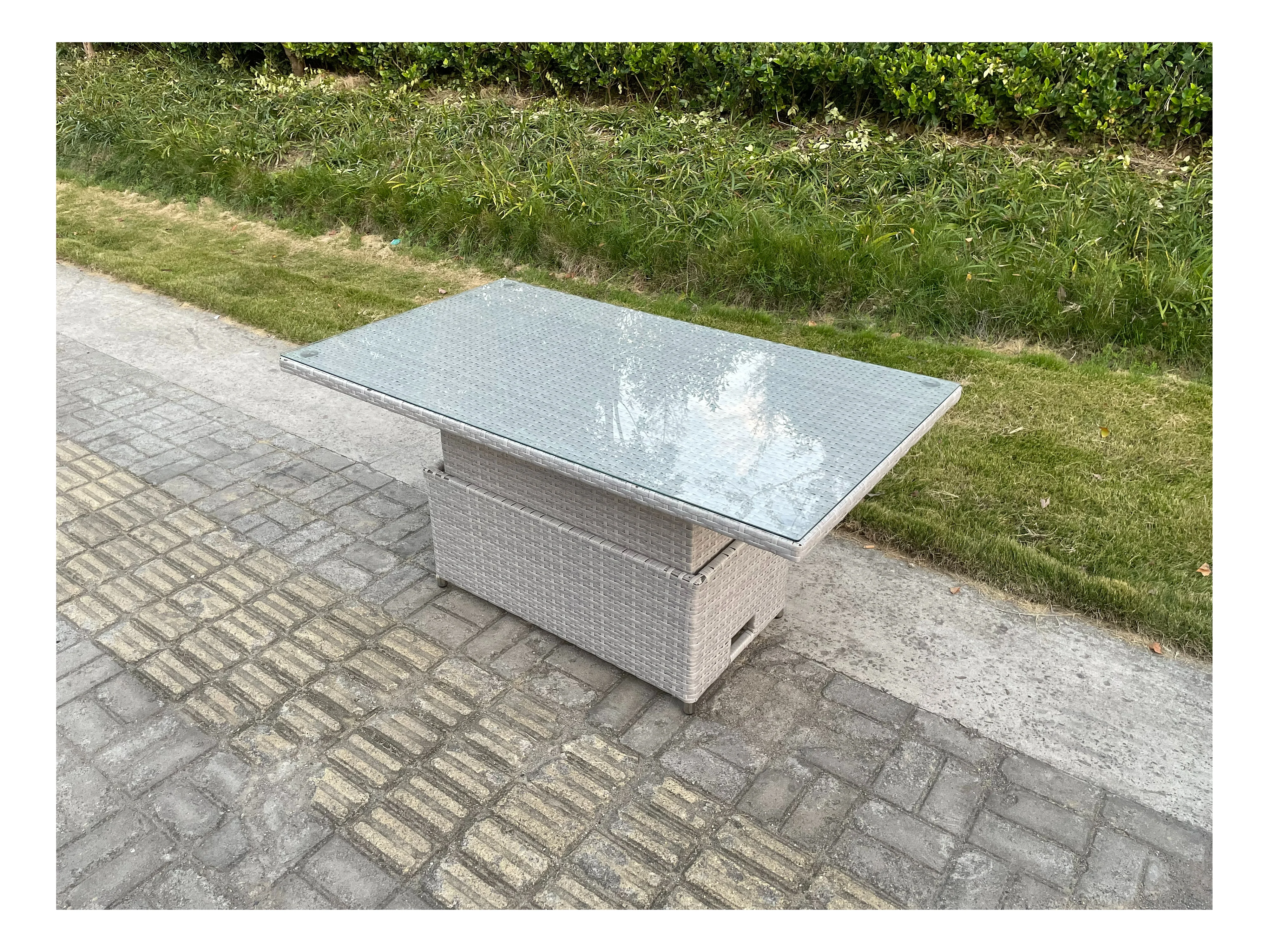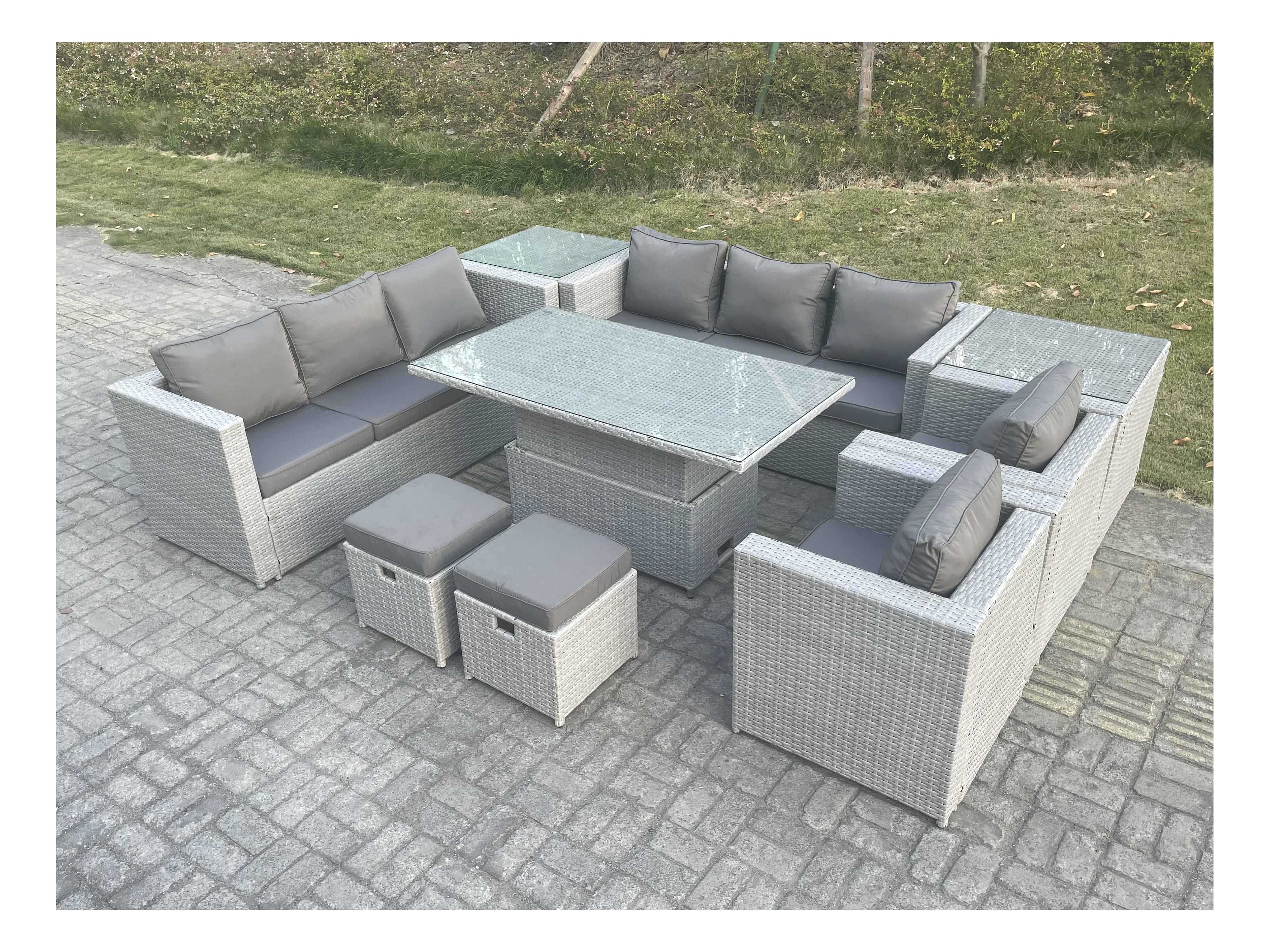Salon de Jardin Exterieur Table à manger réglable en hauteur ave canapé 2 Fauteuil 2 Table d'appoint Petit Tabourets Gris Clair