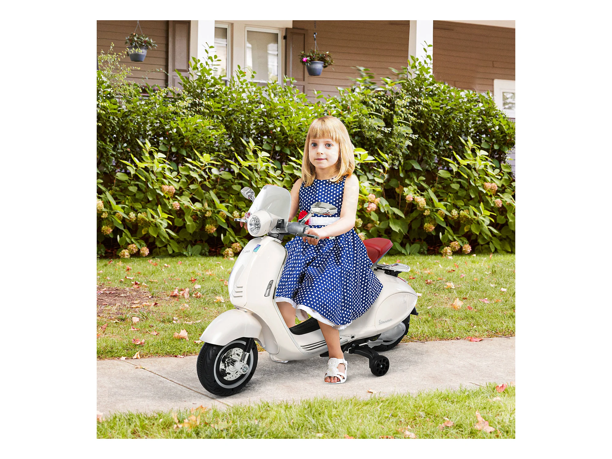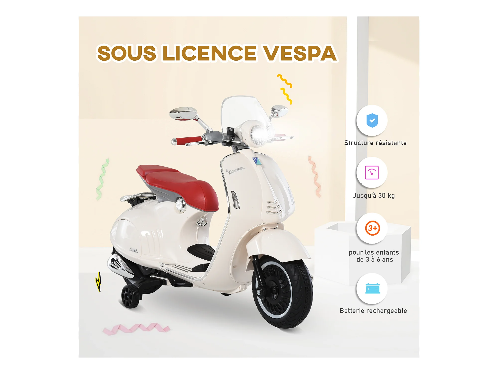 Scooter moto électrique enfant Vespa 6V 30W 2 roulettes auxiliaires effets sonores lumineux crème