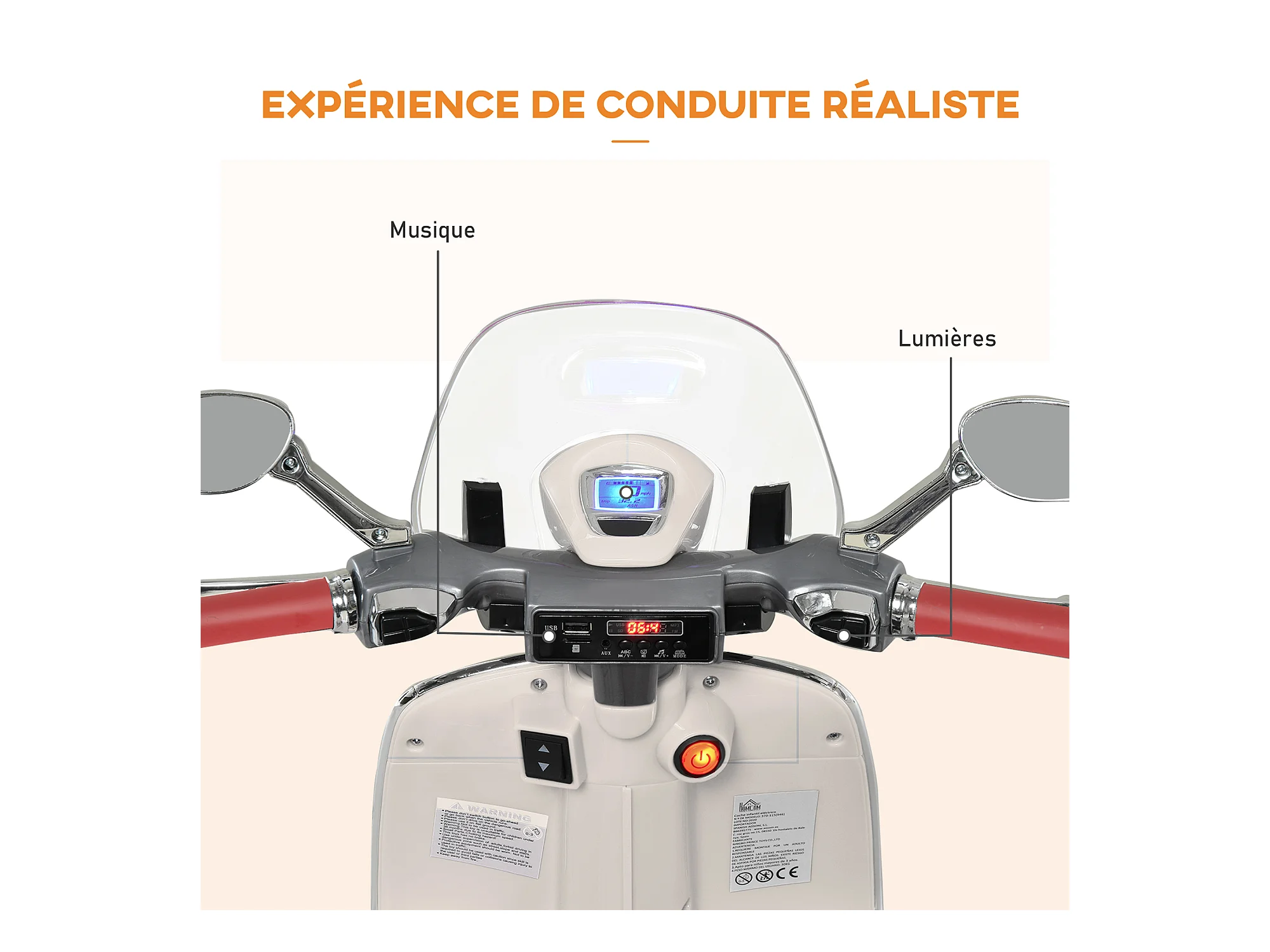 Scooter moto électrique enfants 6 V dim. 102L x 51l x 76H cm musique MP3 port USB klaxon phare feu AR rouge Vespa