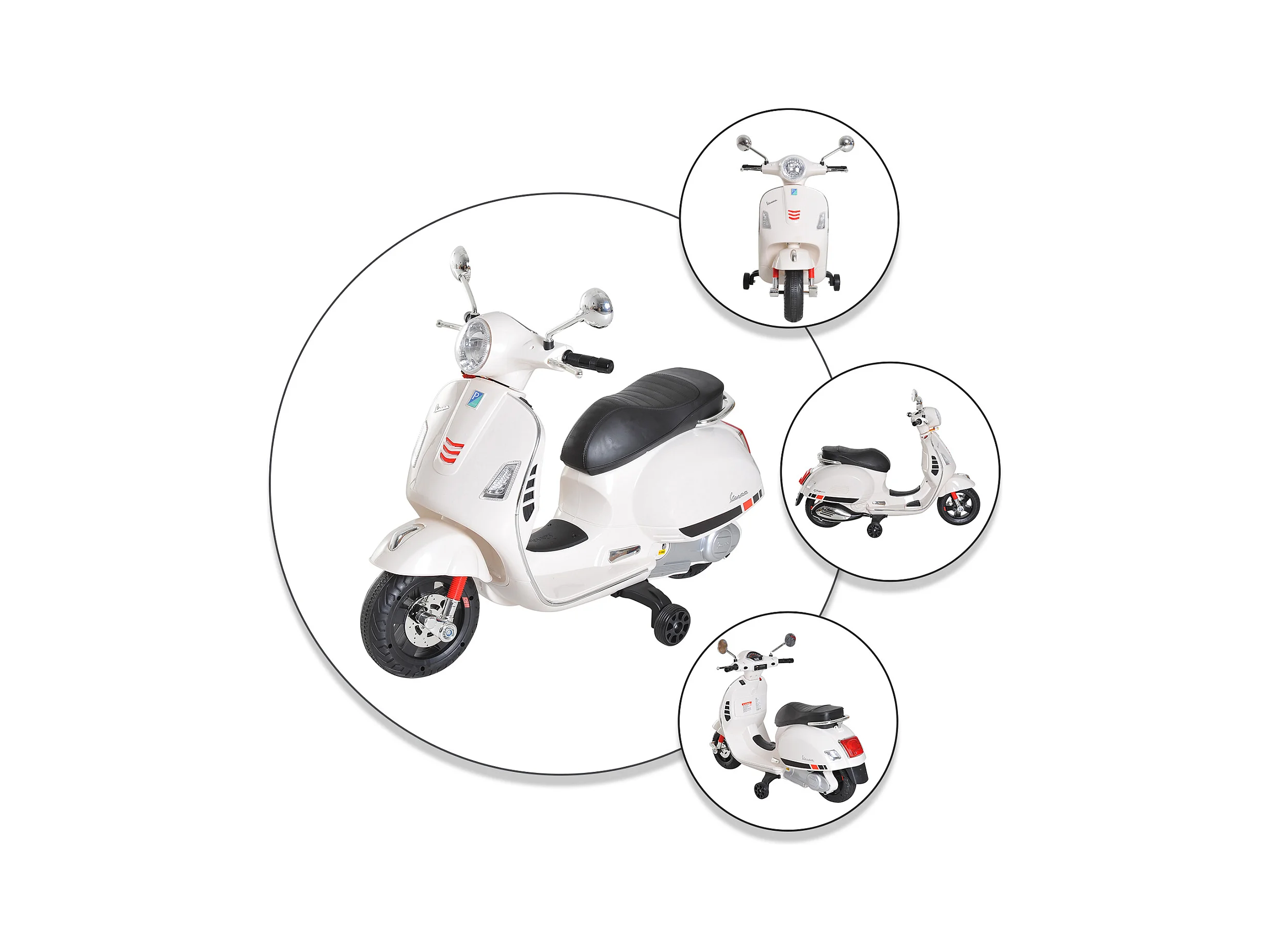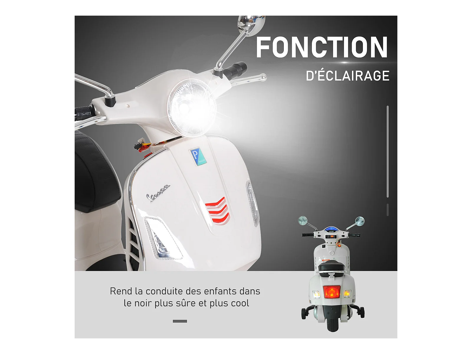 Scooter électrique enfant Vespa 6V - musiques, feu AV, entrée USB, radio FM - 2 roues support aux. - blanc