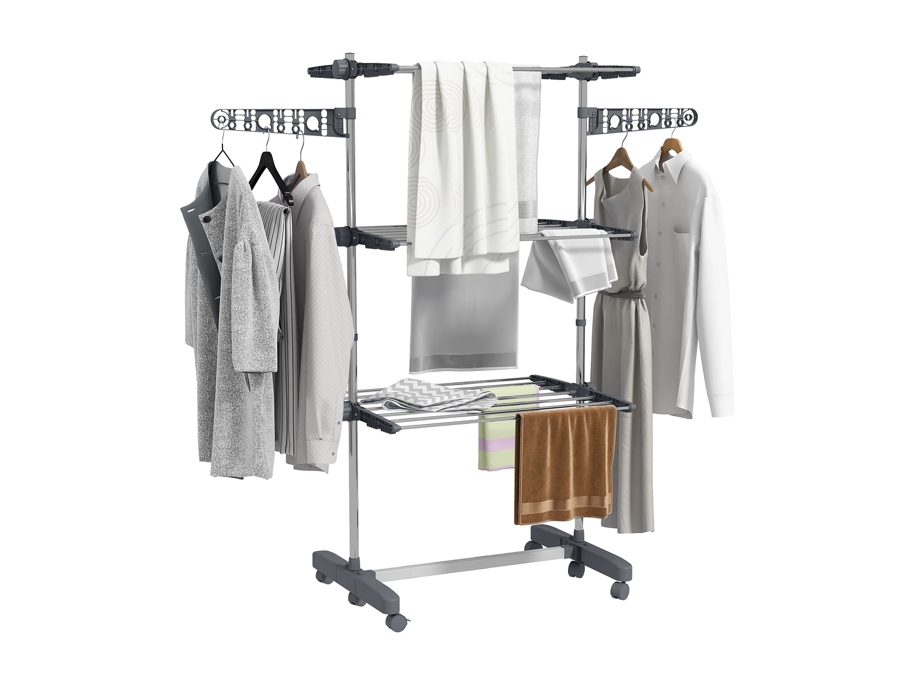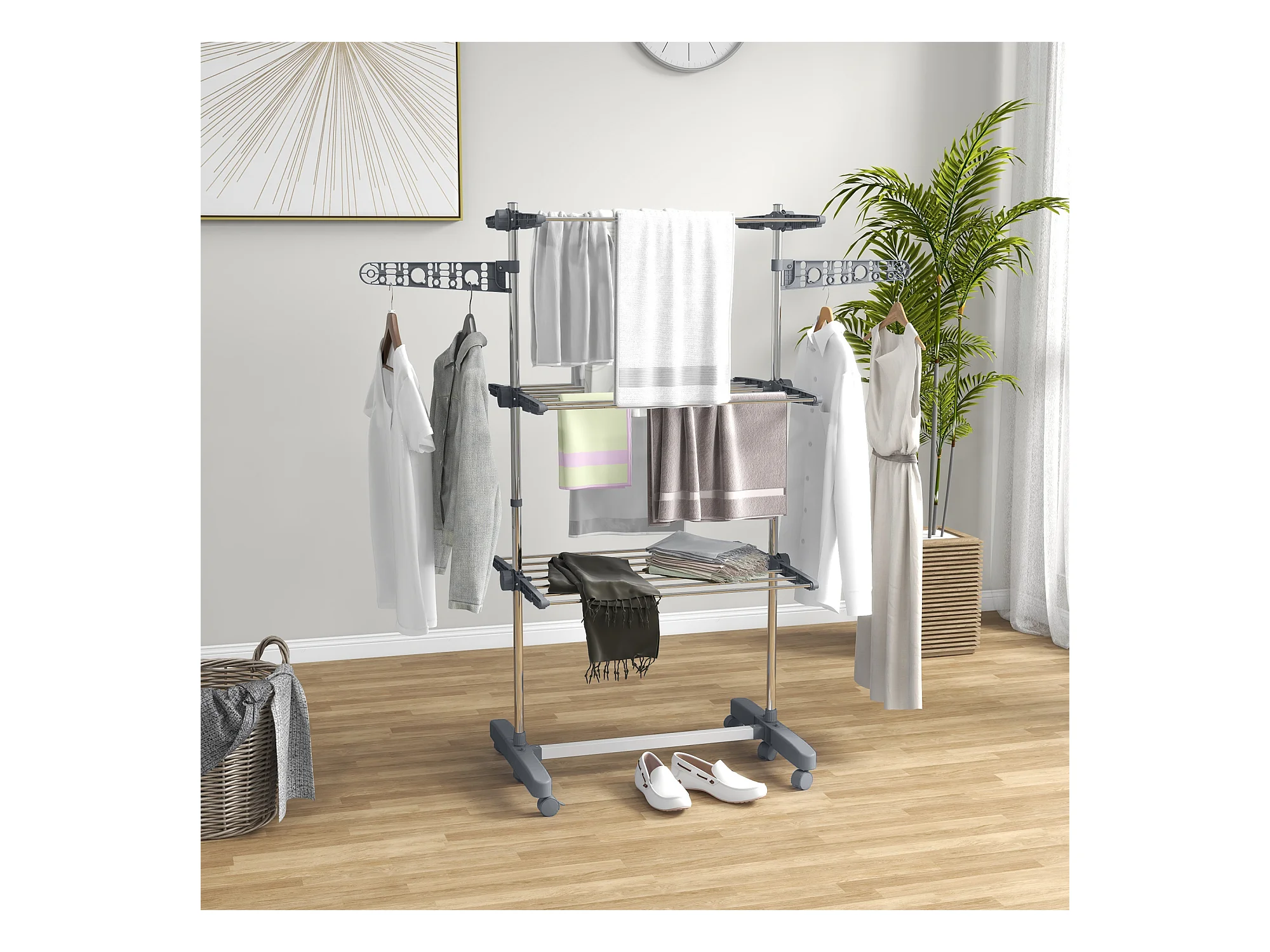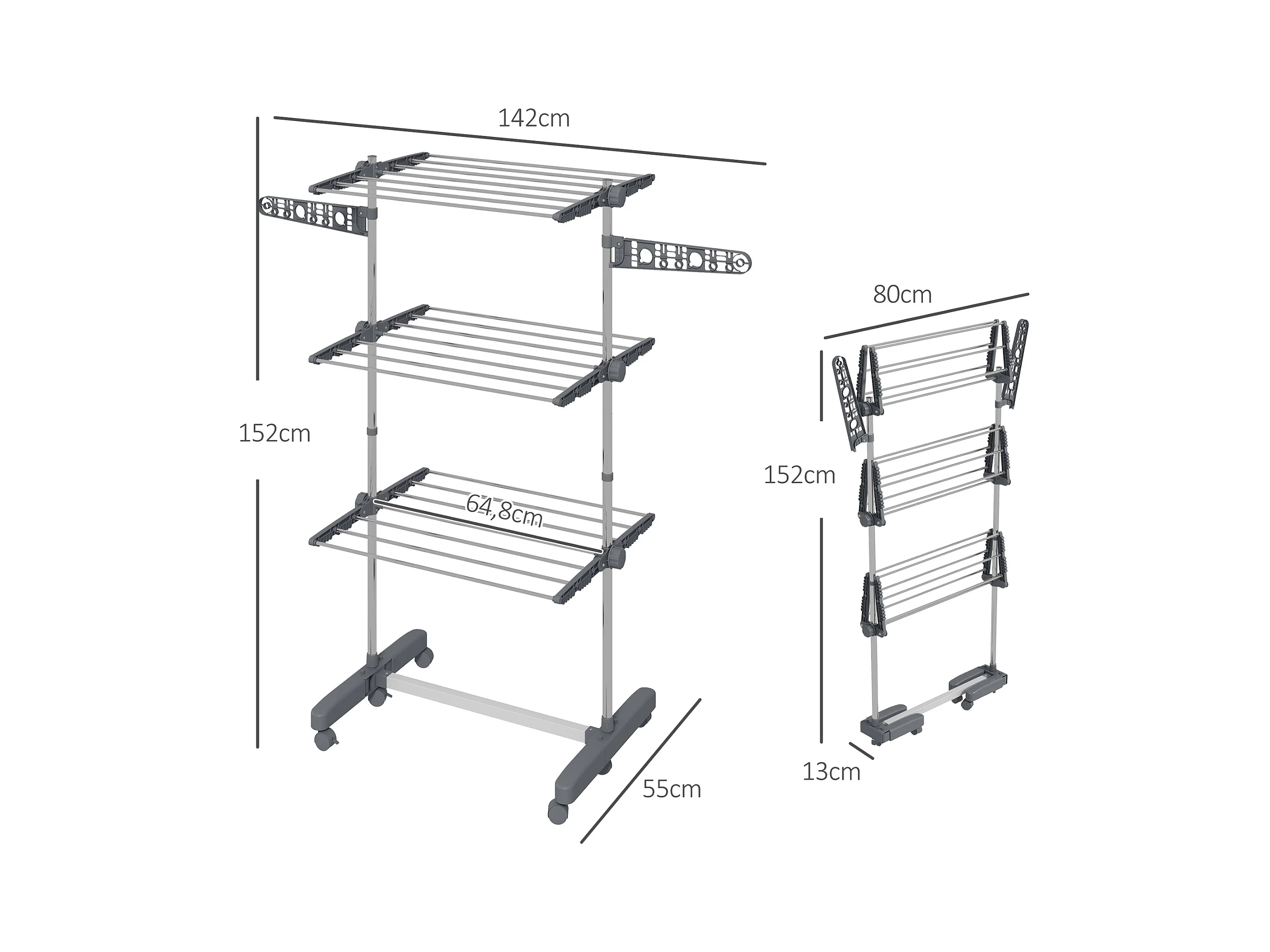 Séchoir à linge étendoir pliable ailes latérales 3 niveaux acier inox PP gris
