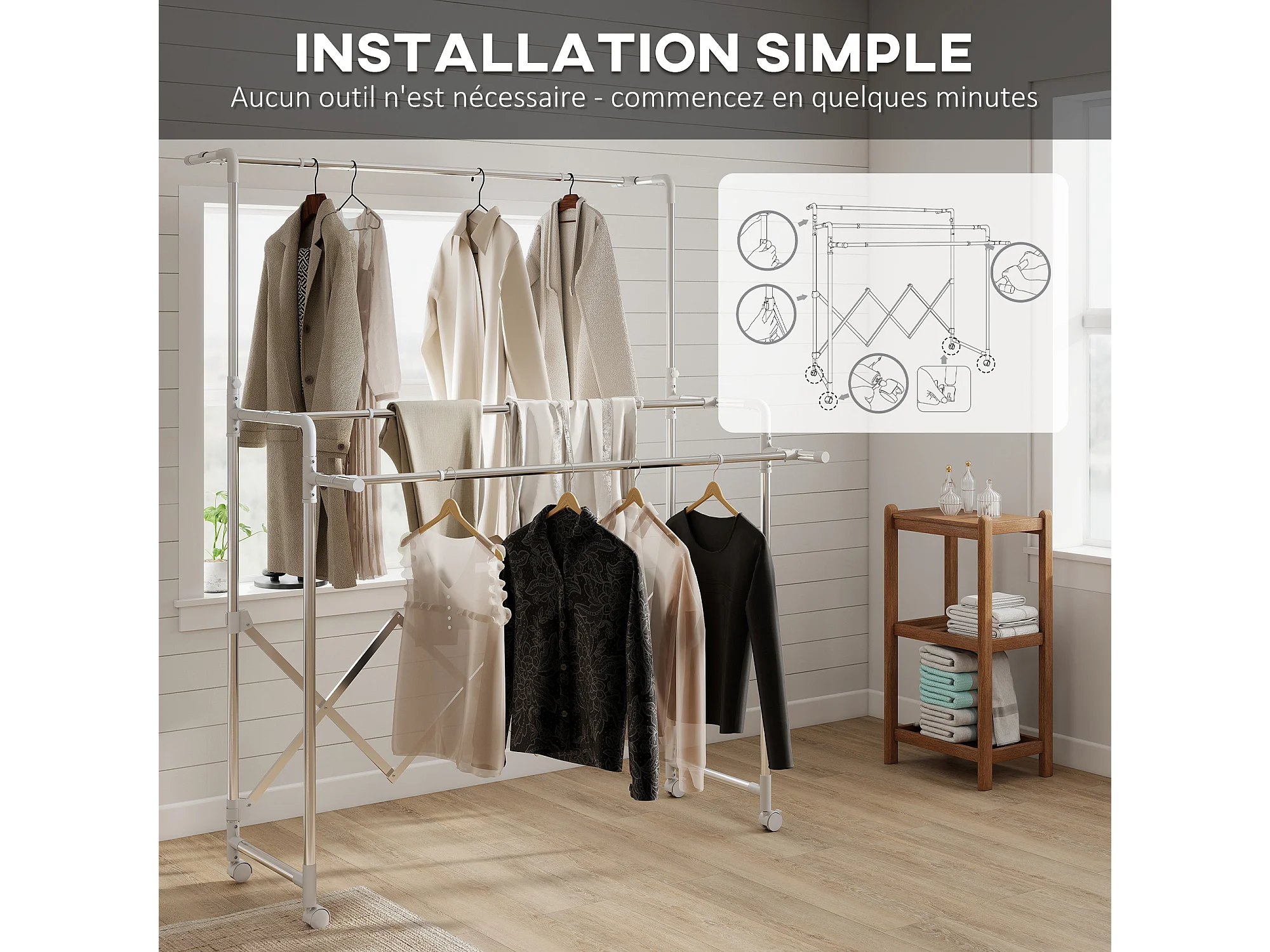 HOMCOM Séchoir à linge étendoir à vêtements pliable réglable avec barre de penderie et roulettes acier inox. PP noir